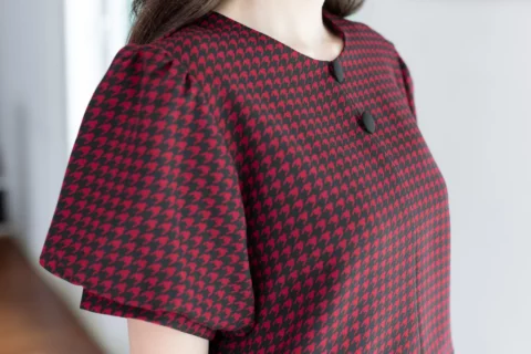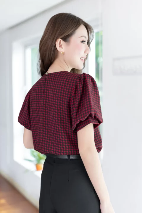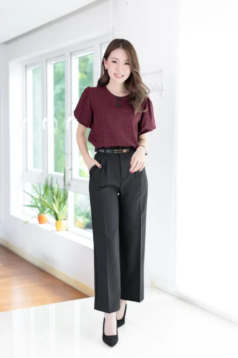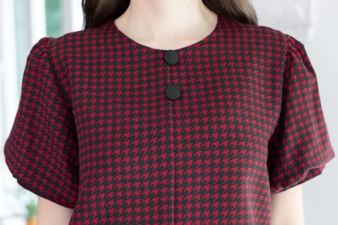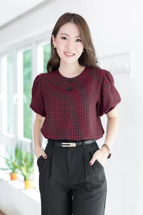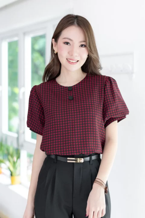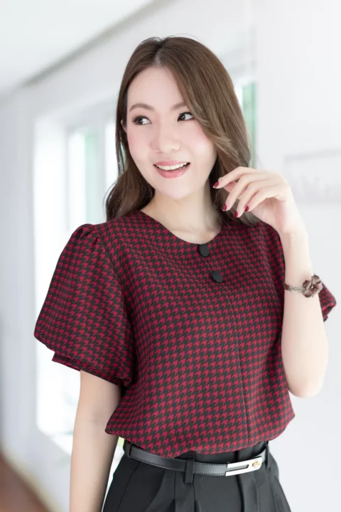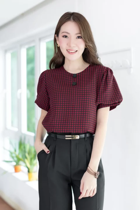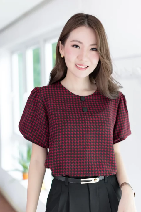 เสื้อคอกลมใส่ง่าย แต่งคัตติ้งตะเข็บตรงกลางด้านหน้า เติมกระดุมหลอกเรียงแถวด้านหน้า 2 เม็ด ดูน่ารัก เนื้อโฟร์เวย์นิ่ม ต่อแขนทรงบอลลูนพองกำลังสวย ด้านหลังเจาะหยดน้ำติดกระดุม งานดีงามค่า