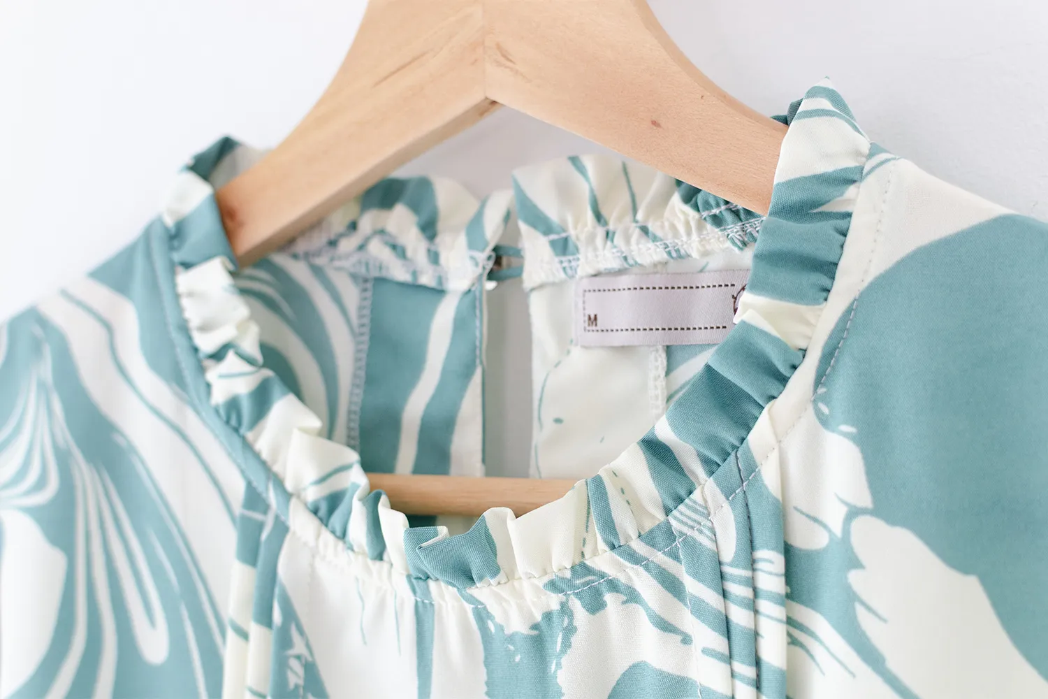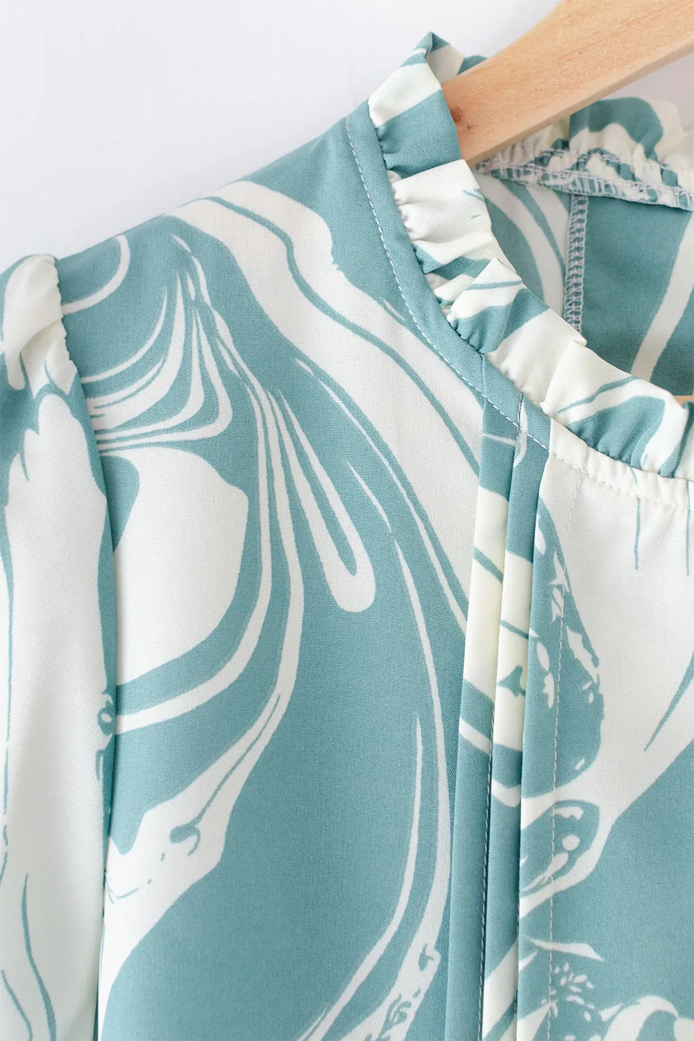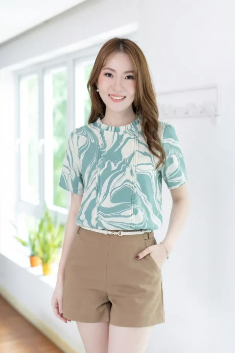 เสื้อทรงหวานมาแบบเรียบหรู ใส่ได้หลายโอกาส คอจีบตั้งนิดๆ แต่งเกล็ดยาวด้านหน้า ใช้ผ้าไหมอิตาลี เนื้อเนียน พิมพ์ลายกราฟิก คอด้านหลังผ่าหยดน้ำสั้นๆติดกระดุม สวมใส่สะดวก