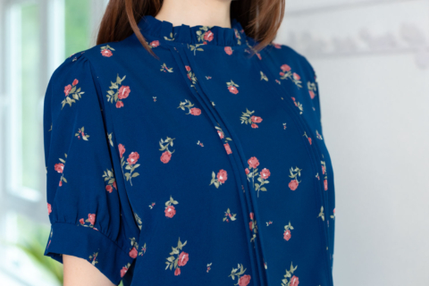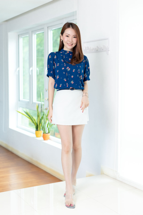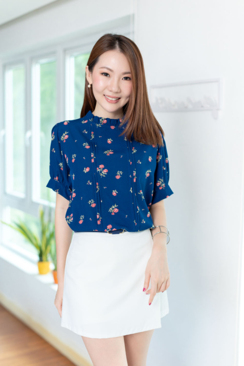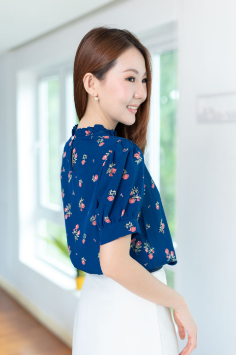 เสื้อทำงานทรงหวาน เสริมความอ่อนโยนคอจีบตั้งนิดๆ ตีเกล็ดตกแต่งด้านหน้า ต่อแขนบอลลูน ผ้าพิมพ์ลายดอกกุหลาบ ผ้านิ่ม ใส่สบาย ทรงเสื้อสวยแมทช์แบบหวานๆ ชอบมากค่ะ
