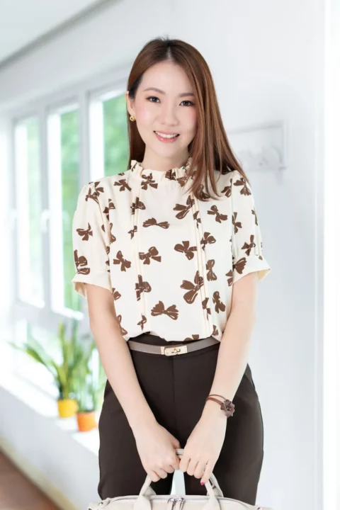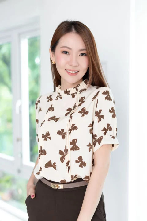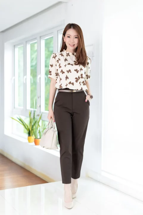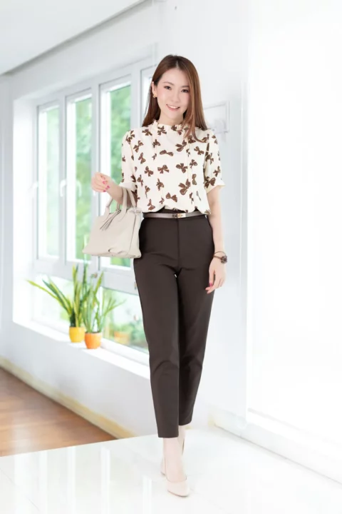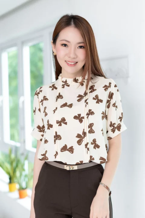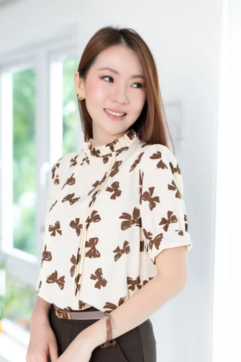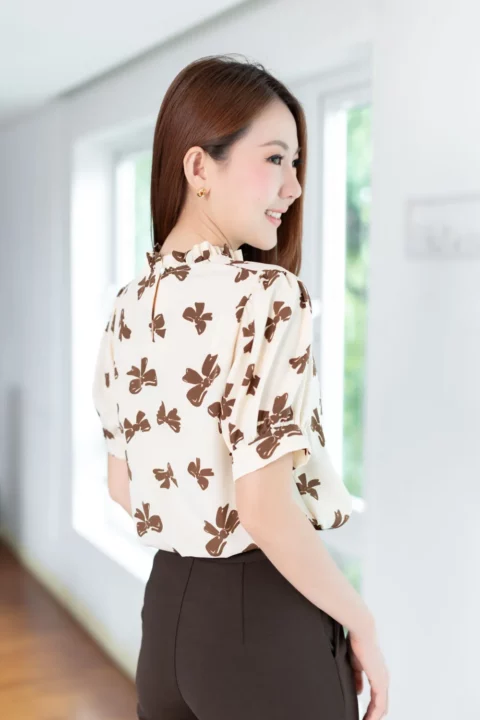 เสื้อทำงานทรงหวาน เสริมความอ่อนโยนคอจีบตั้งนิดๆ ตีเกล็ดตกแต่งด้านหน้า ต่อแขนบอลลูน ผ้าพิมพ์ลายโบว์เนื้อดี นิ่ม ใส่สบาย ทรงเสื้อสวยแมทช์แบบหวานๆ ชอบมากค่ะ
