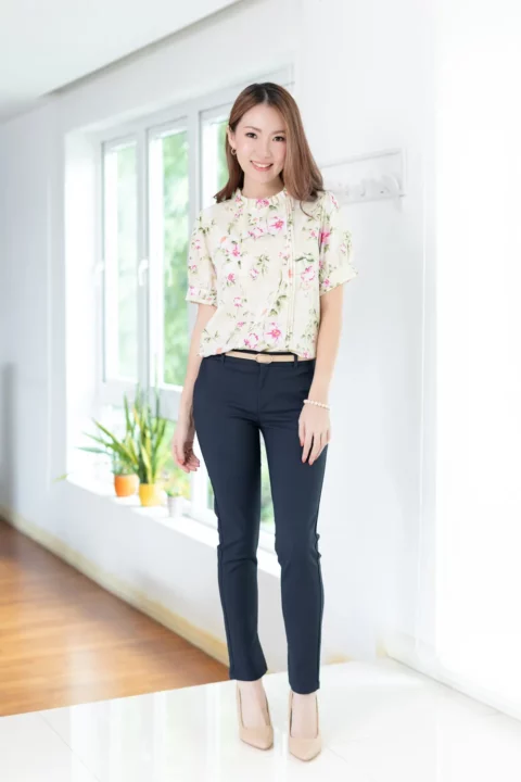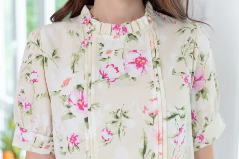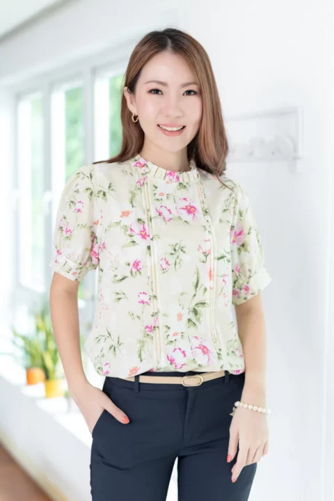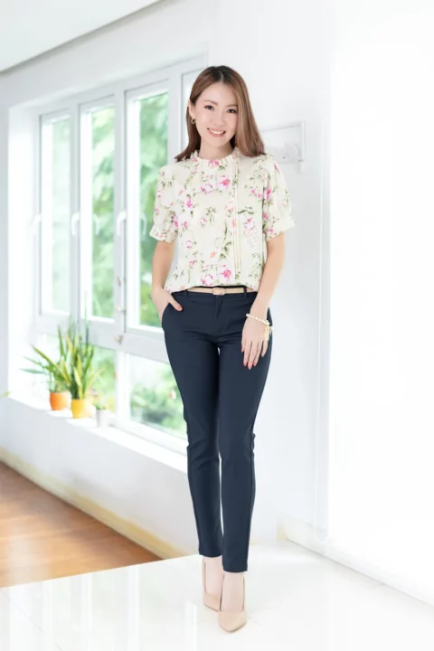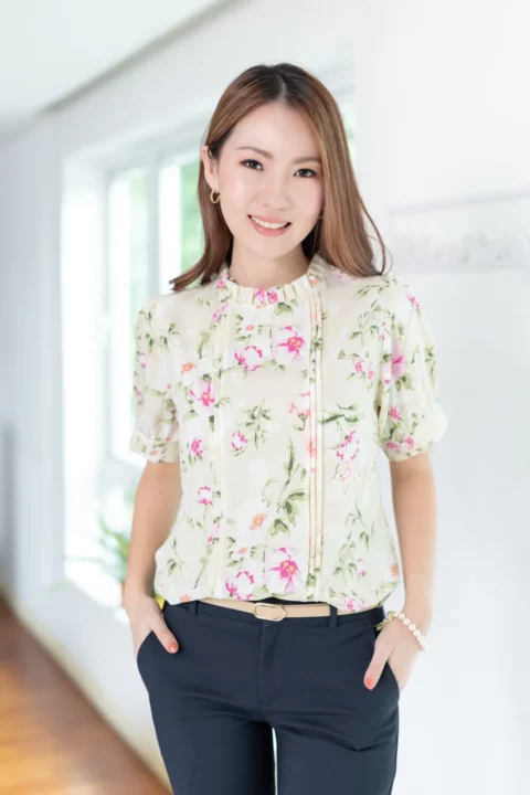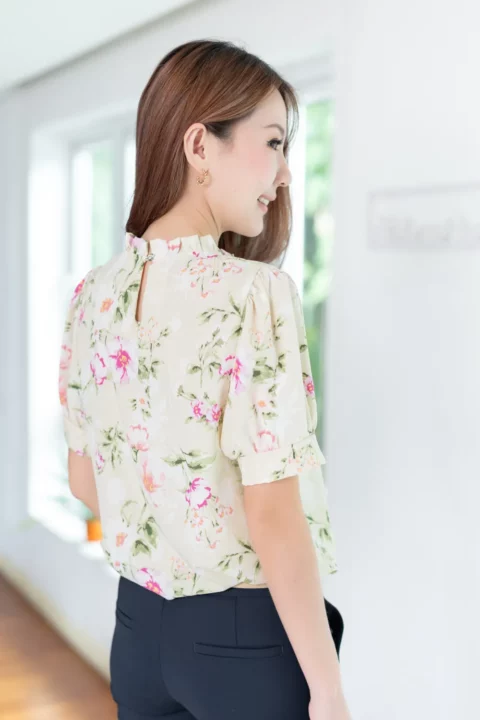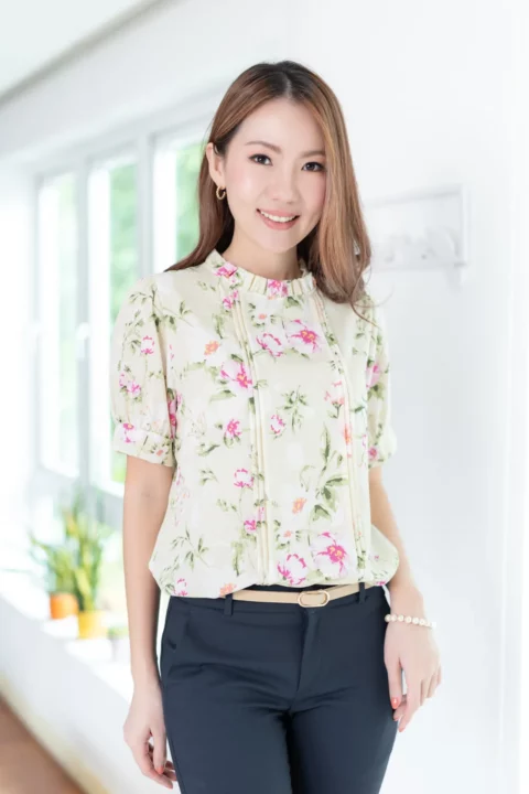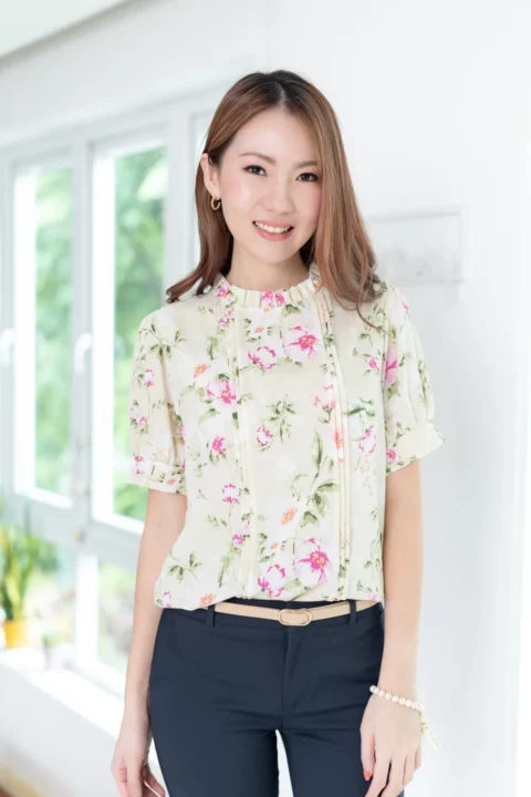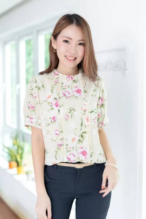 เสื้อทำงานทรงหวาน เสริมความอ่อนโยนคอจีบตั้งนิดๆ ตีเกล็ดตกแต่งด้านหน้า ต่อแขนบอลลูน ผ้าพิมพ์ลายดอกไม้เนื้อดี นิ่ม ใส่สบาย ทรงเสื้อสวยแมทช์แบบหวานๆ ชอบมากค่ะ