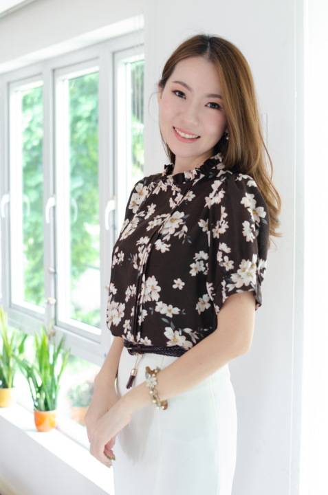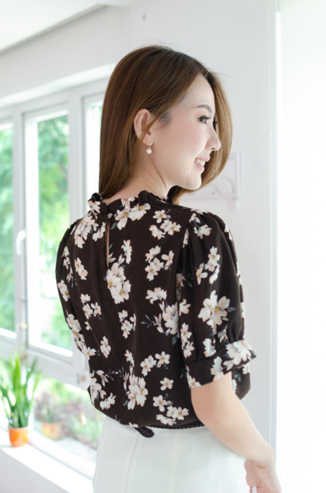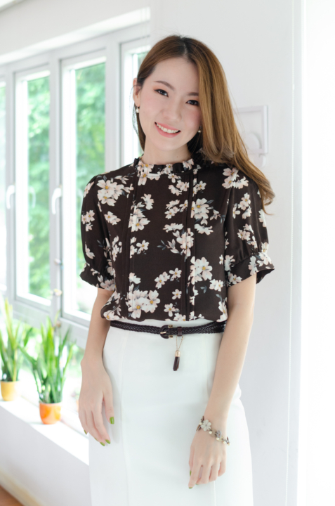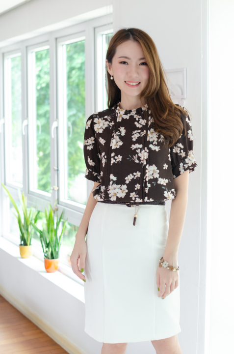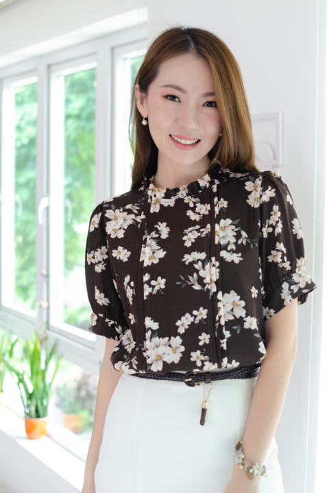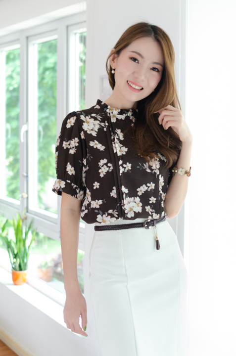 เสื้อทำงานทรงหวาน เสริมความอ่อนโยน คอจีบตั้งนิดๆ ตีเกล็ดตกแต่งด้านหน้า ต่อแขนบอลลูน แพทเทิร์นคอดเอวสูงนิดๆ ผ้าพิมพ์ลายดอกไม้ ทรงเสื้อสวยแมทช์แบบหวานๆเลย