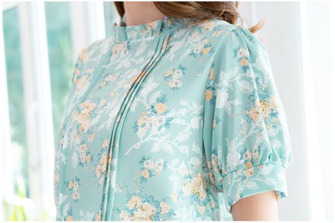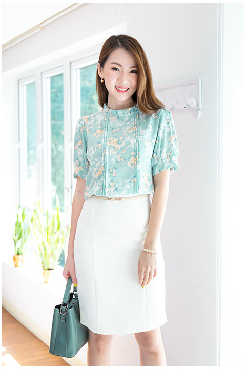 เสื้อทำงานทรงหวาน เสริมความอ่อนโยน คอจีบตั้งนิดๆ ตีเกล็ดตกแต่งด้านหน้า ต่อแขนบอลลูน เนื้อผ้าอิตาลีนิ่มๆ พิมพ์ลายดอกไม้ ทรงเสื้อสวยแมทช์แบบหวานๆเลย