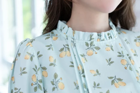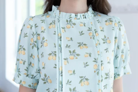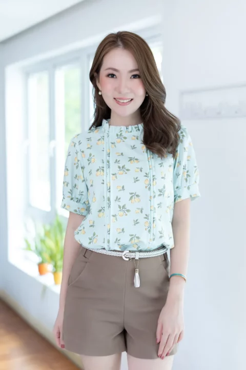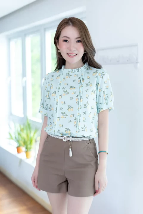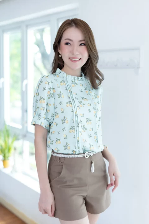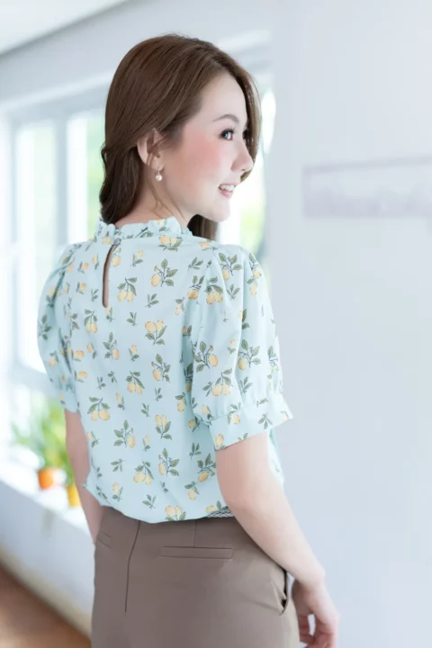 เสื้อทำงานทรงหวาน เสริมความอ่อนโยนคอจีบตั้งนิดๆ ตีเกล็ดตกแต่งด้านหน้า ต่อแขนบอลลูน พิมพ์ลายเลมอน ทรงเสื้อสวยแมทช์แบบหวานๆ