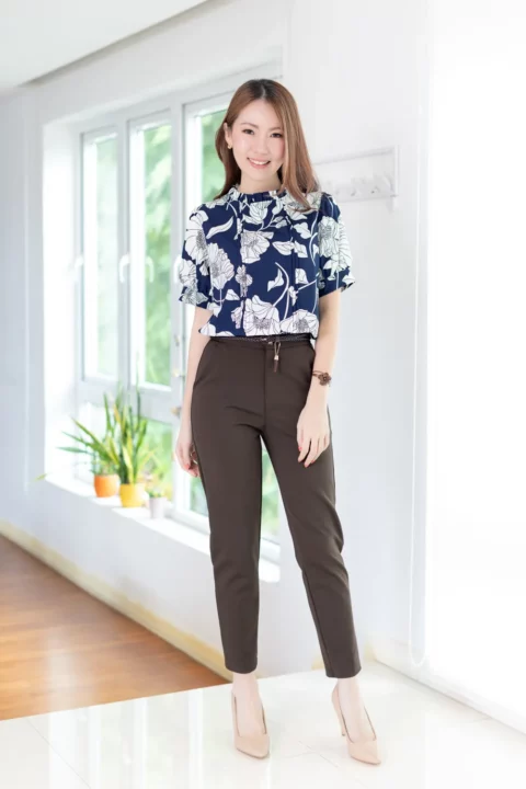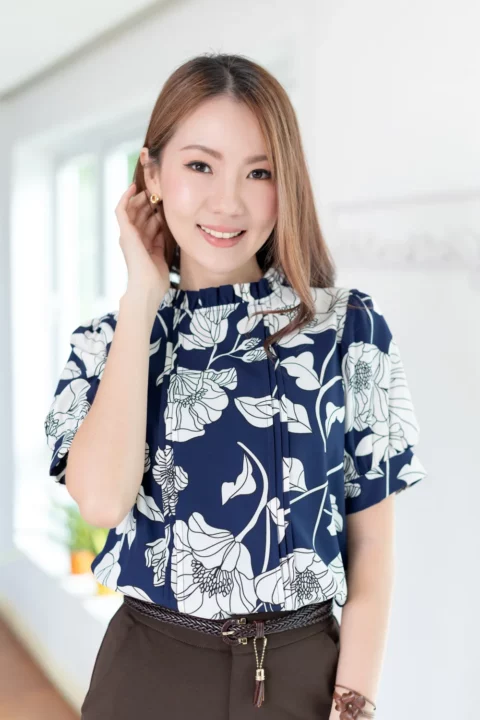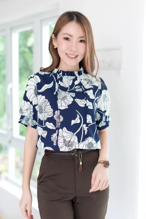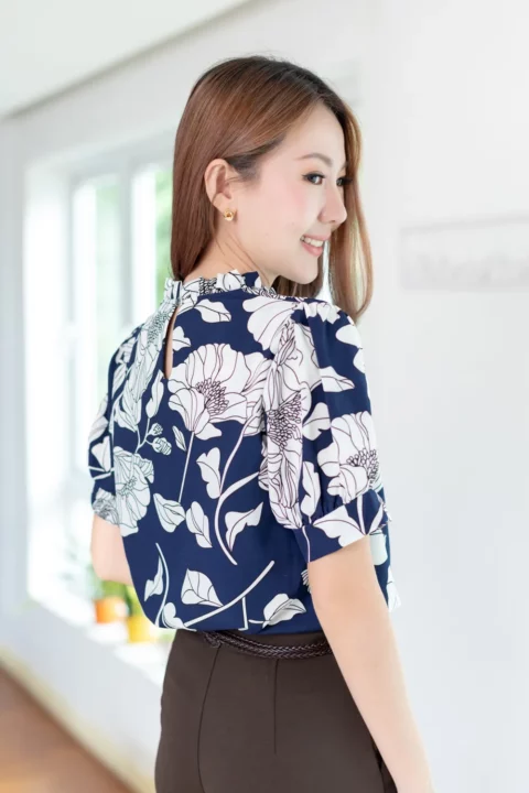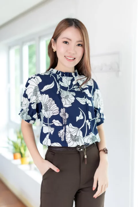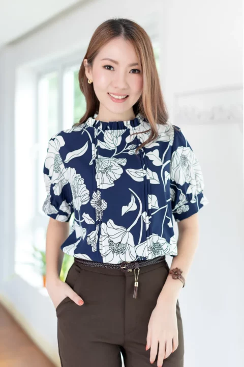 เสื้อทำงานทรงหวาน เสริมความอ่อนโยนคอจีบตั้งนิดๆ ตีเกล็ดตกแต่งด้านหน้า ต่อแขนบอลลูน ผ้าพิมพ์ลายดอกไม้เนื้อดี นิ่ม ใส่สบาย ทรงเสื้อสวยแมทช์แบบหวานๆ ชอบมากค่ะ