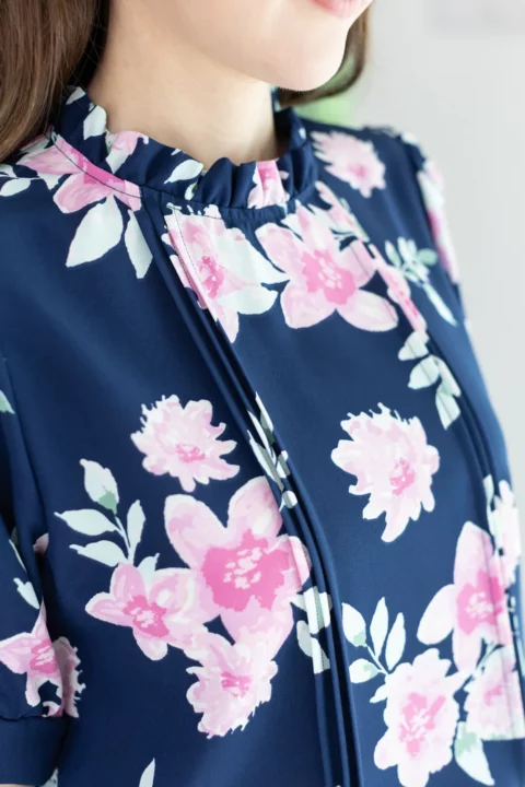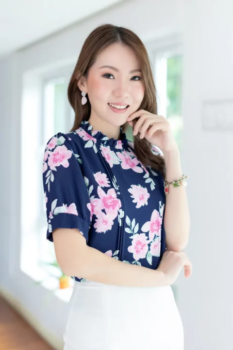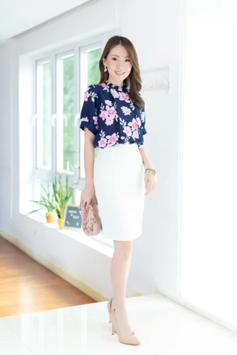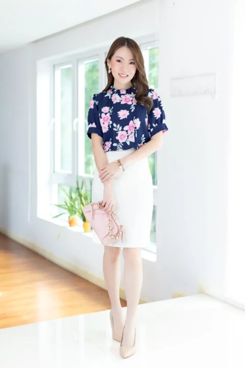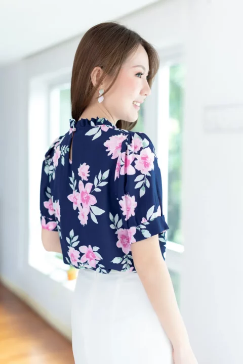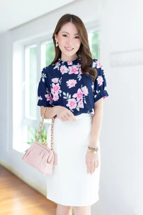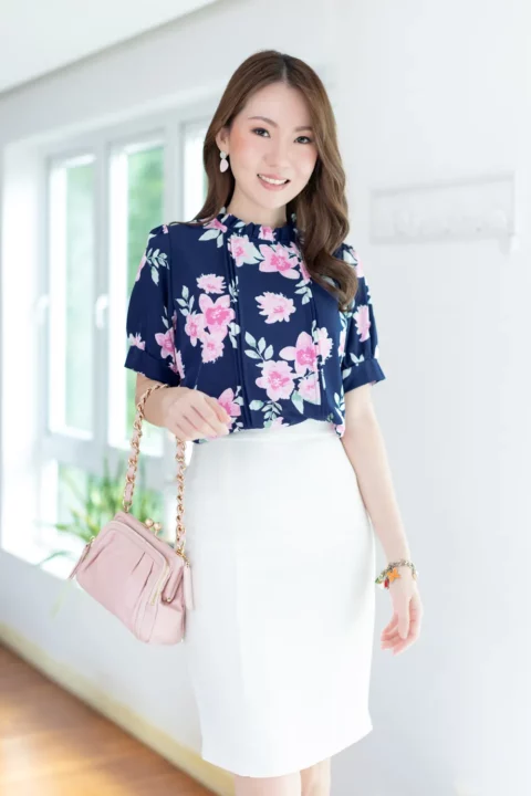 เสื้อทำงานทรงหวาน เสริมความอ่อนโยนคอจีบตั้งนิดๆ ตีเกล็ดตกแต่งด้านหน้า ต่อแขนบอลลูน ผ้าพิมพ์ลายดอกไม้เนื้อดี นิ่ม ใส่สบาย ทรงเสื้อสวยแมทช์แบบหวานๆ ชอบมากค่ะ