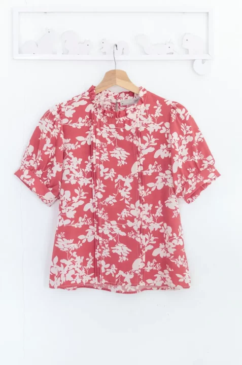 เสื้อทำงานทรงหวาน เสริมความอ่อนโยนคอจีบตั้งนิดๆ ตีเกล็ดตกแต่งด้านหน้า ต่อแขนบอลลูน พิมพ์ลายดอกไม้ ทรงเสื้อสวยแมทช์แบบหวานๆ
