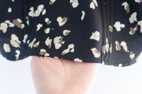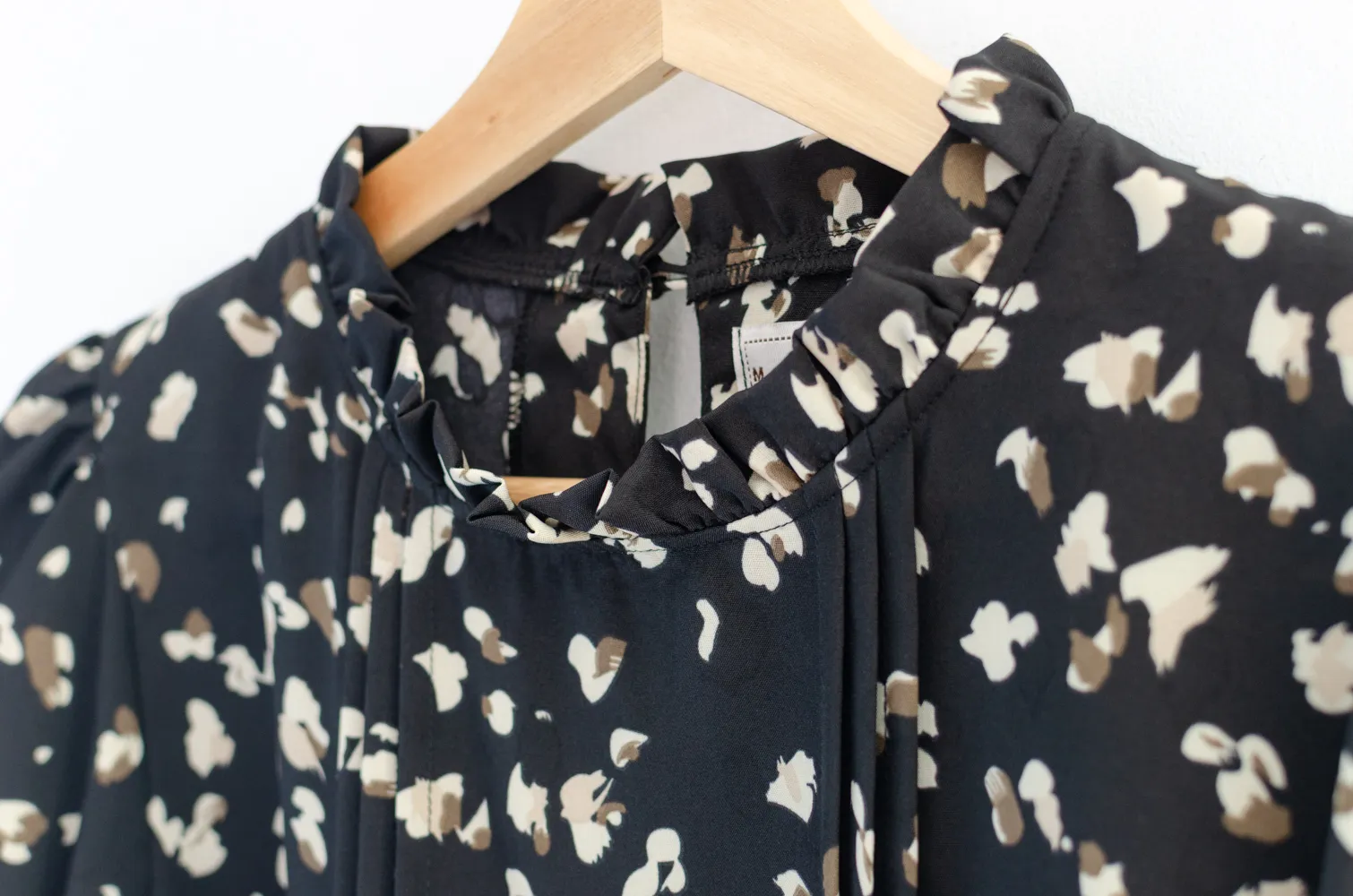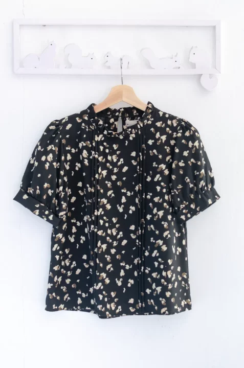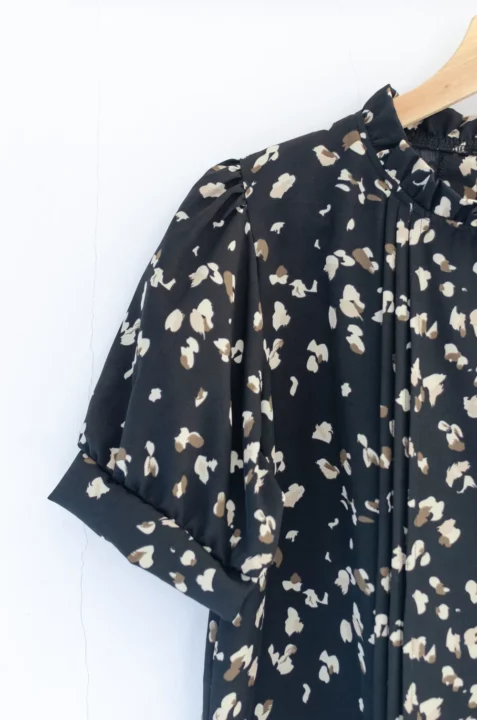 เสื้อทำงานทรงหวาน เสริมความอ่อนโยนคอจีบตั้งนิดๆ ตีเกล็ดตกแต่งด้านหน้า ต่อแขนบอลลูน พิมพ์ลายกราฟิก ทรงเสื้อสวยแมทช์แบบหวานๆ