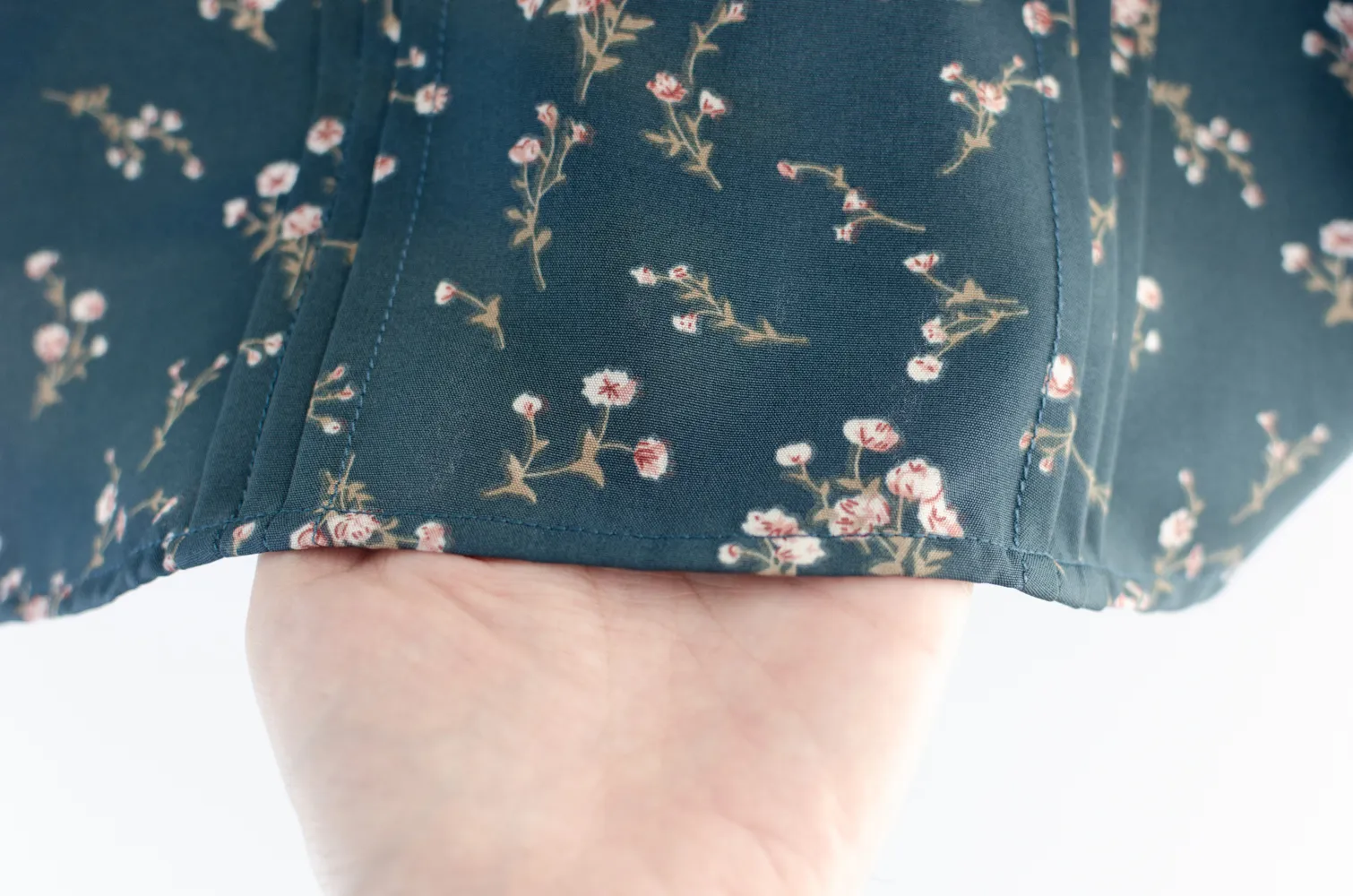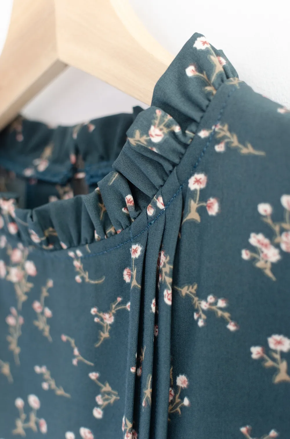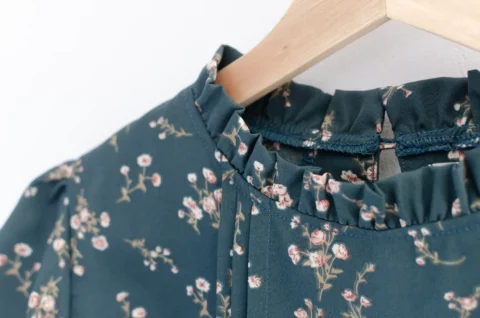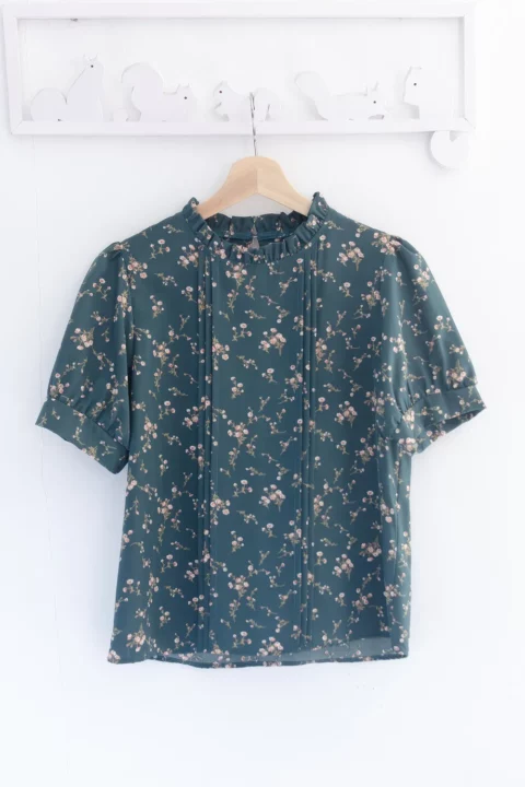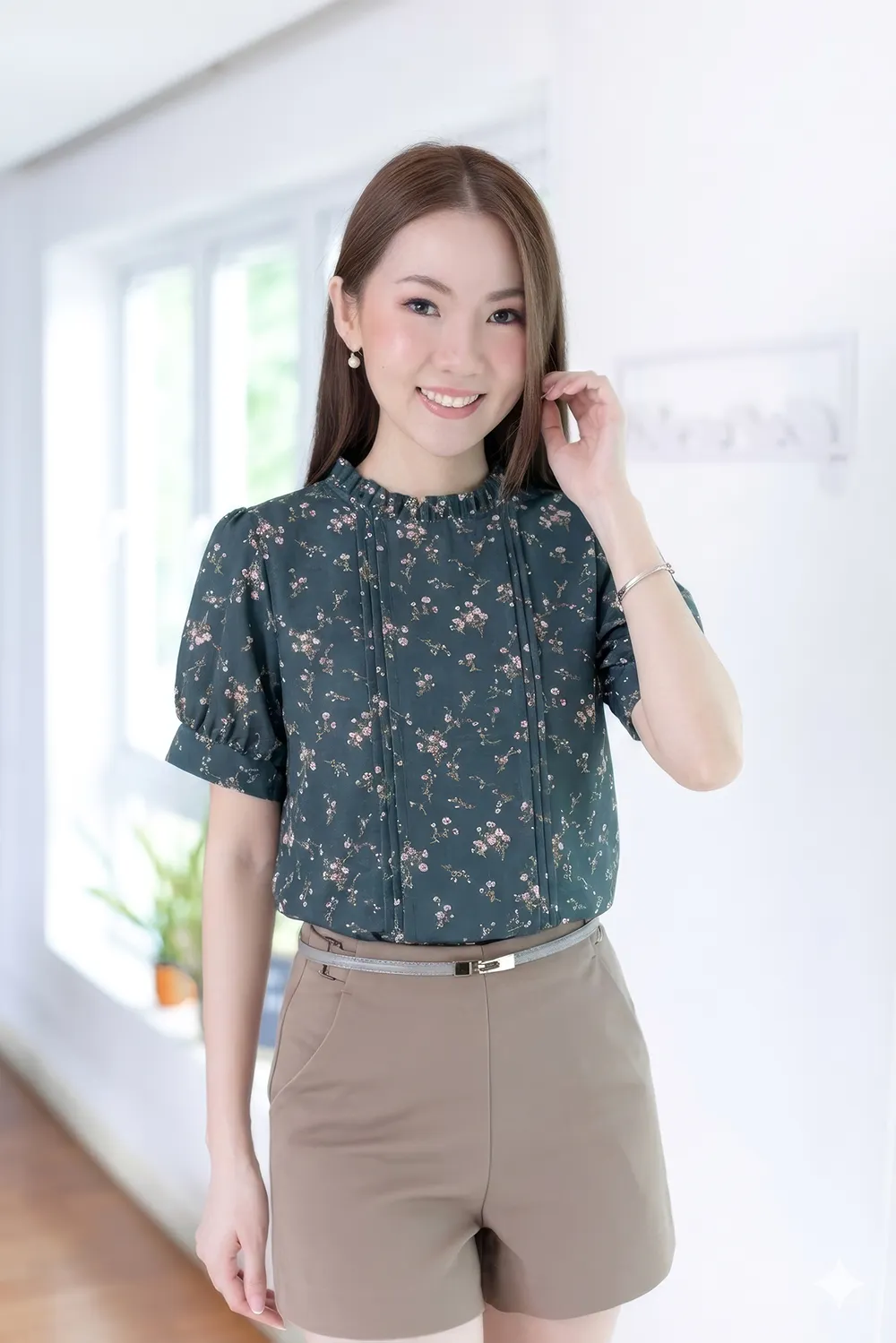 เสื้อทำงานทรงหวาน เสริมความอ่อนโยนคอจีบตั้งนิดๆ ตีเกล็ดตกแต่งด้านหน้า ต่อแขนบอลลูน พิมพ์ลายดอกไม้ ทรงเสื้อสวยแมทช์แบบหวานๆ