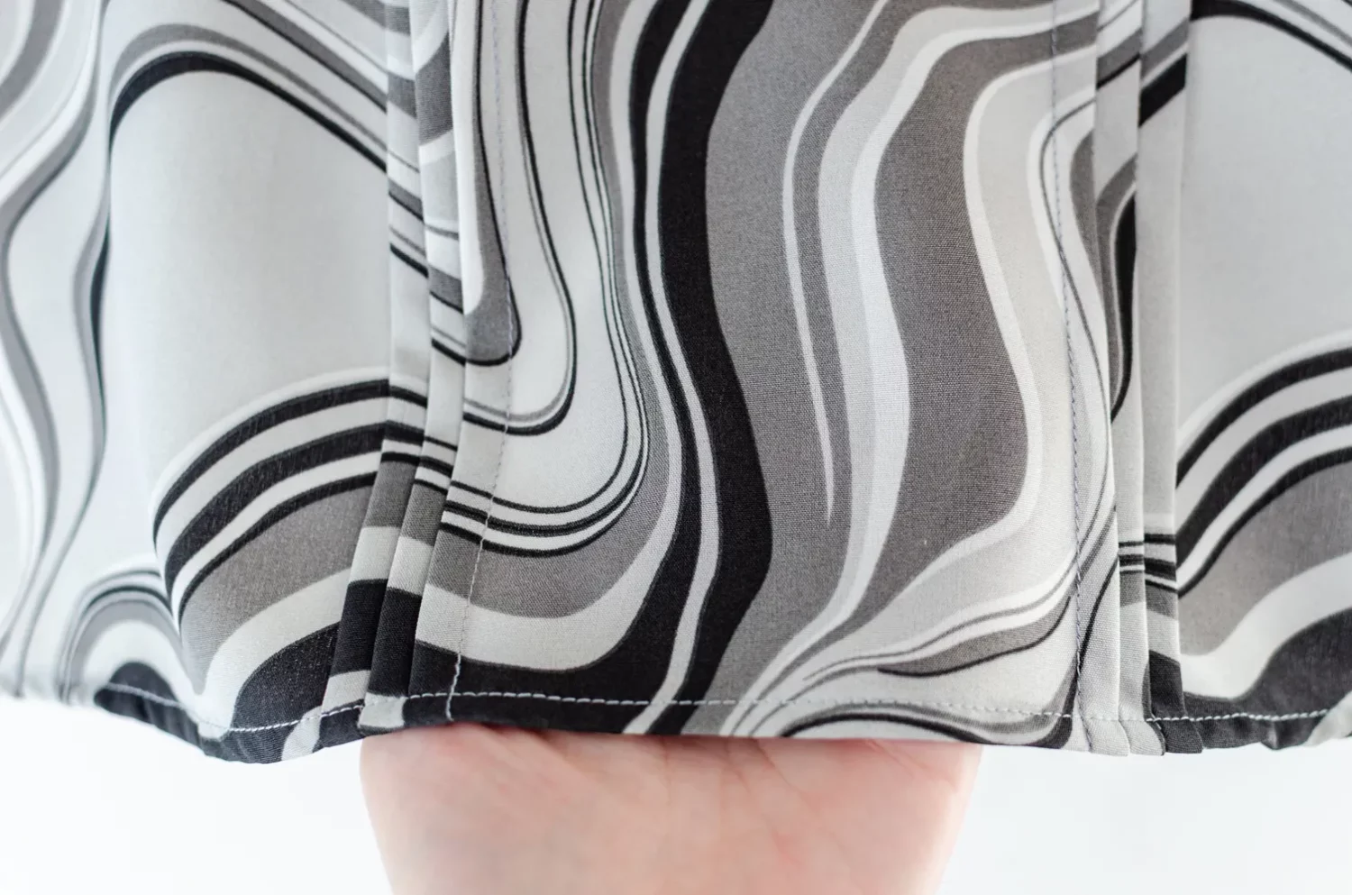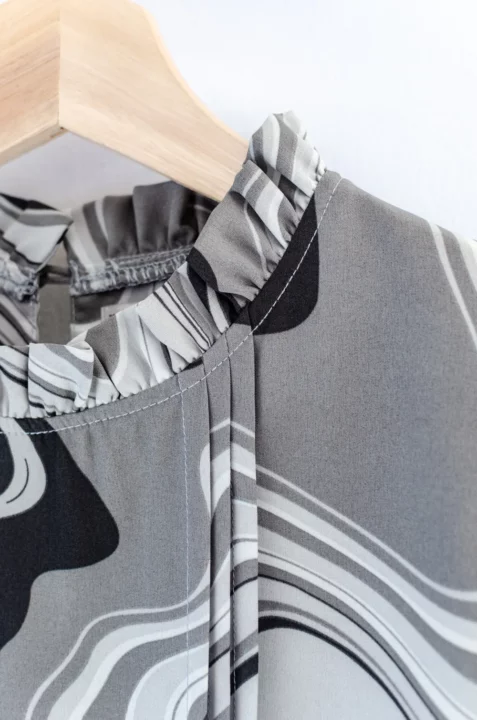 เสื้อทำงานทรงหวาน เสริมความอ่อนโยนคอจีบตั้งนิดๆ ตีเกล็ดตกแต่งด้านหน้า ต่อแขนบอลลูน พิมพ์ลายกราฟิก ทรงเสื้อสวยแมทช์แบบหวานๆ