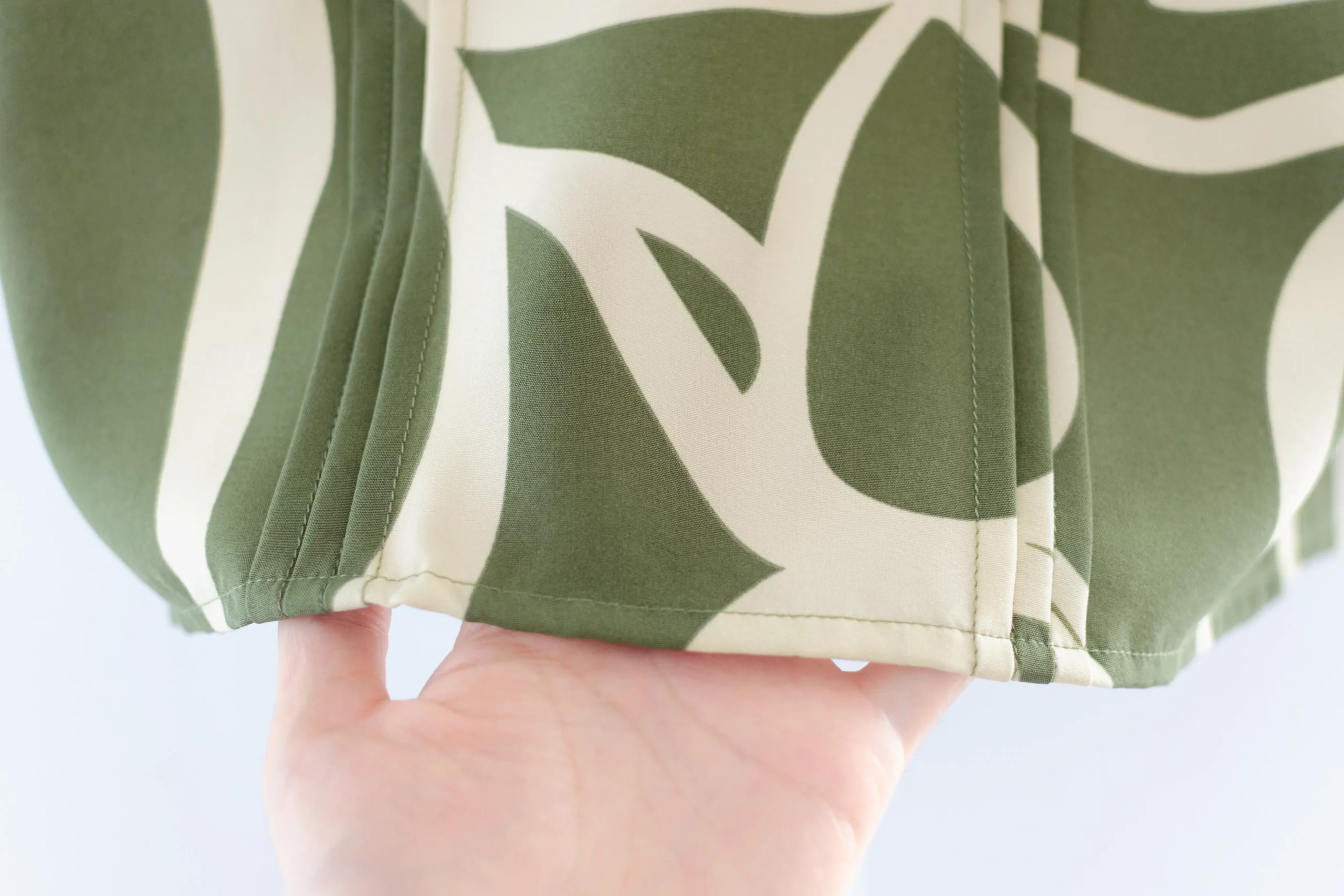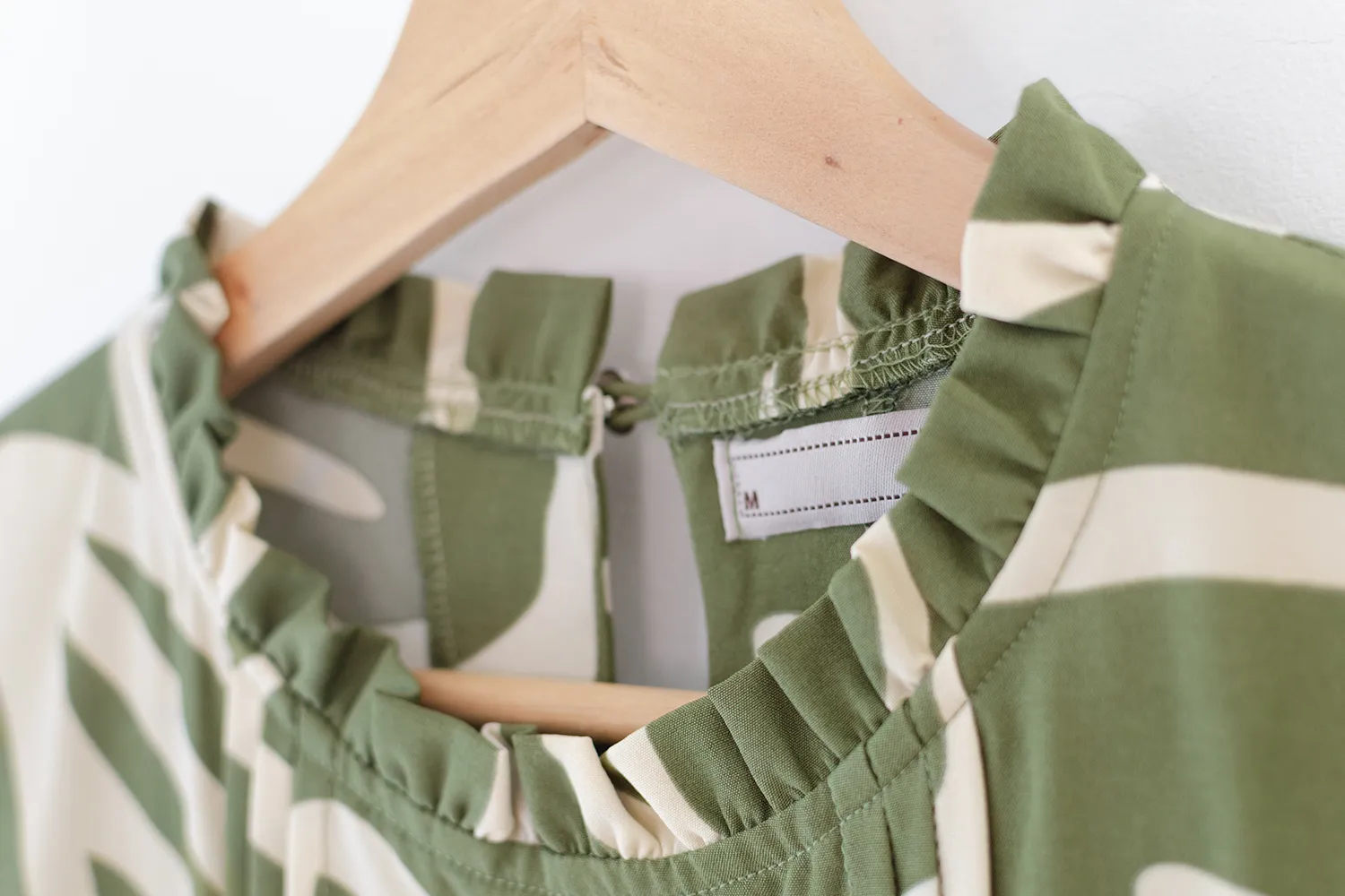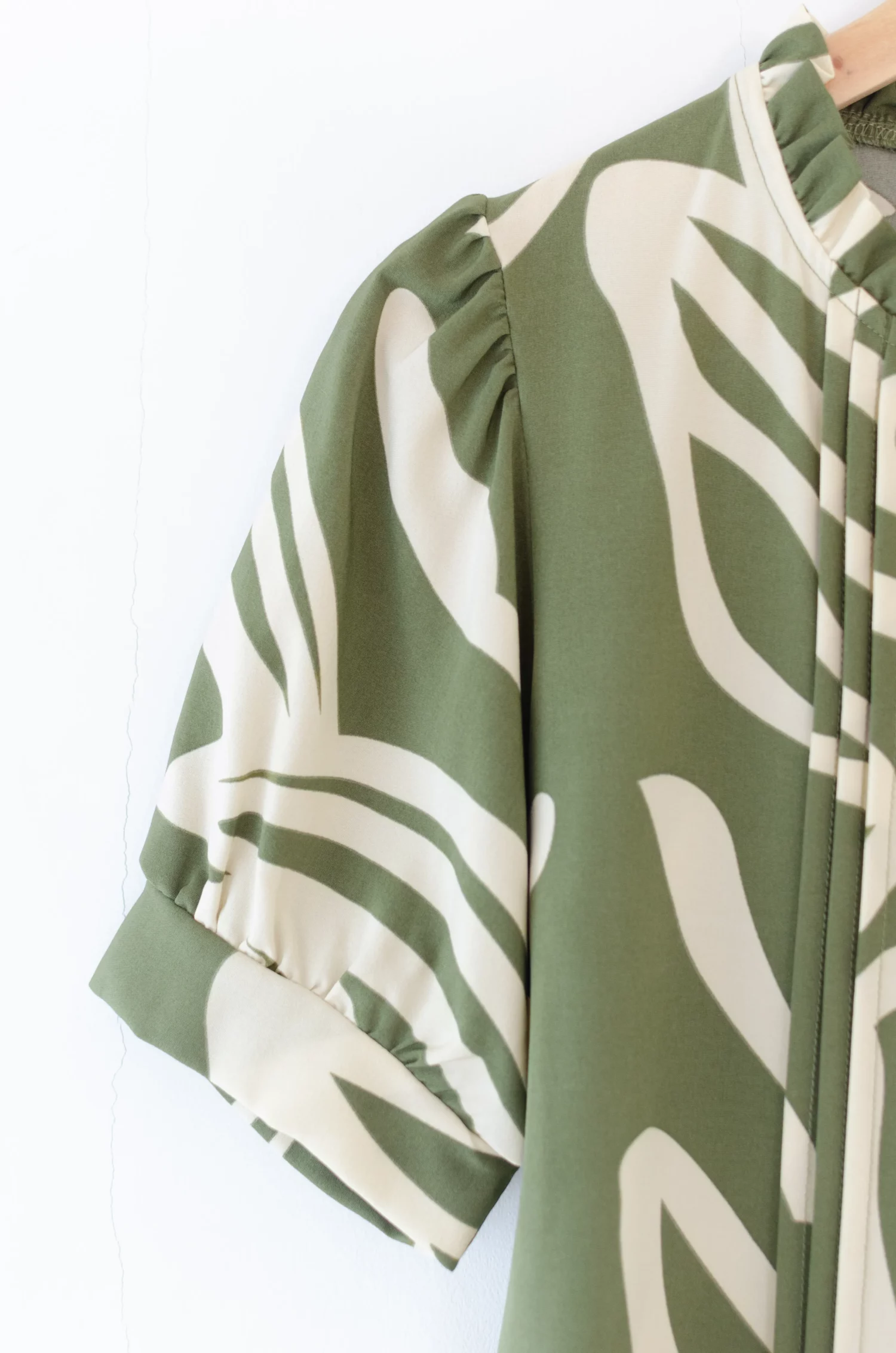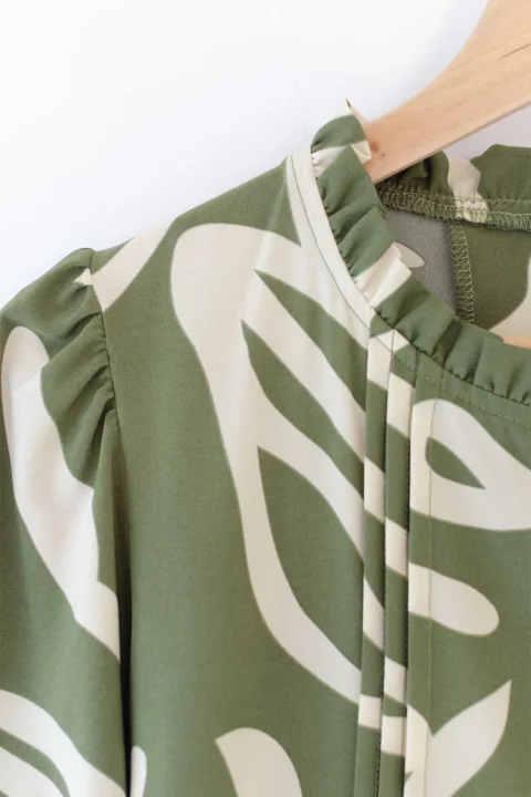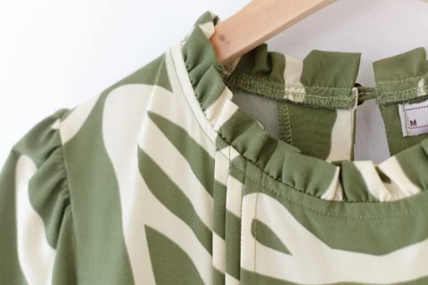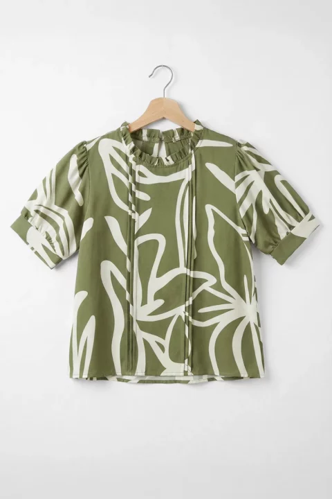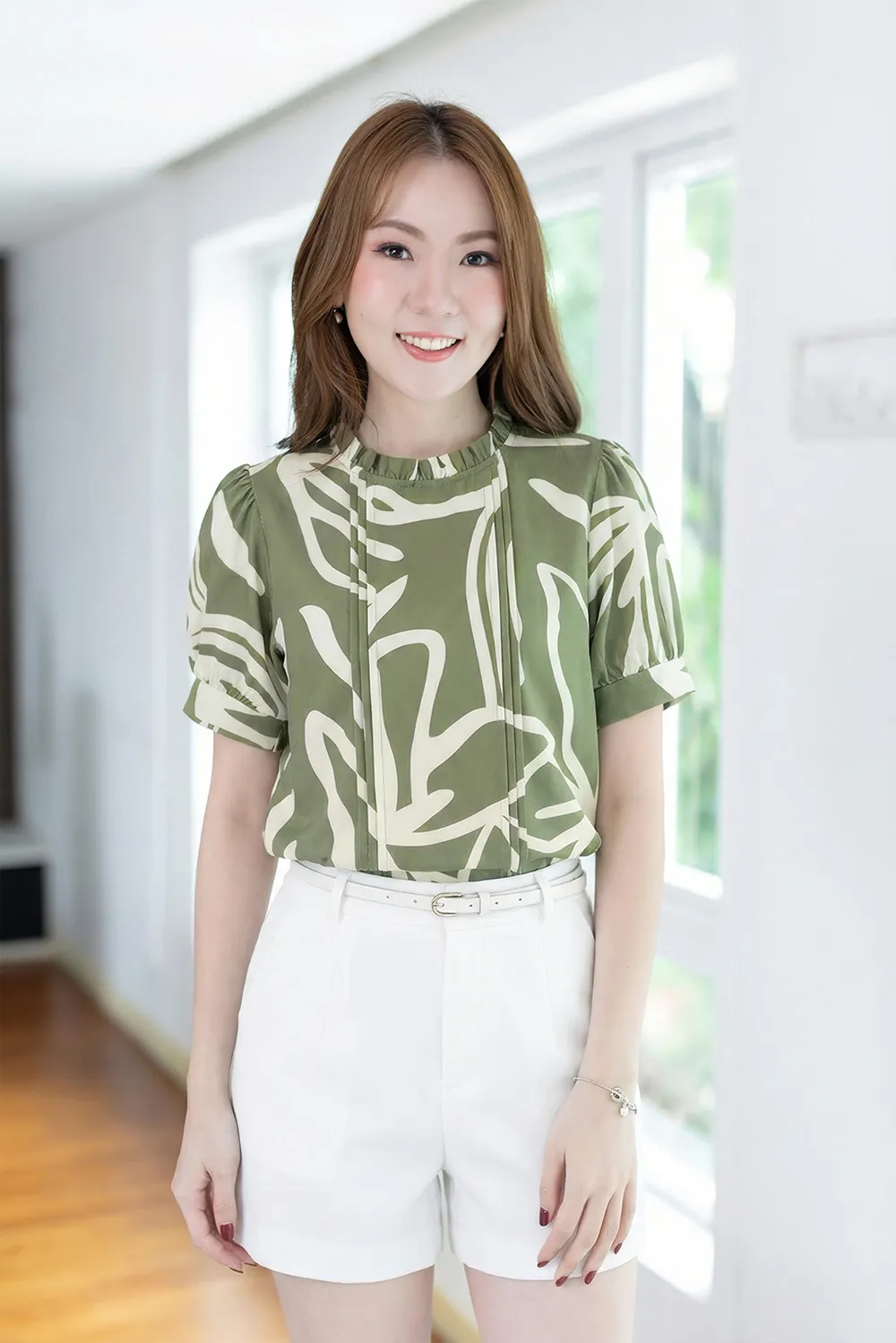 เสื้อทำงานทรงหวาน เสริมความอ่อนโยนคอจีบตั้งนิดๆ ตีเกล็ดตกแต่งด้านหน้า ต่อแขนบอลลูน พิมพ์ลายกราฟิก ทรงเสื้อสวยแมทช์แบบหวานๆ