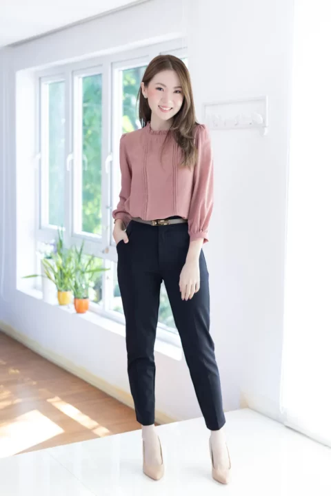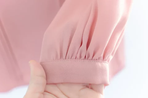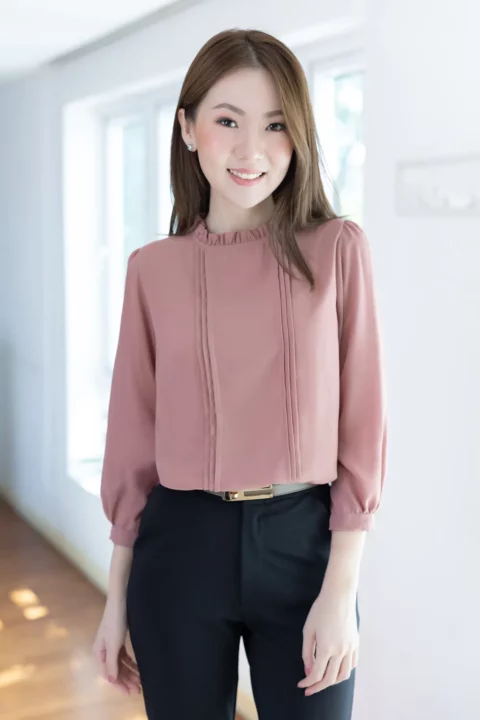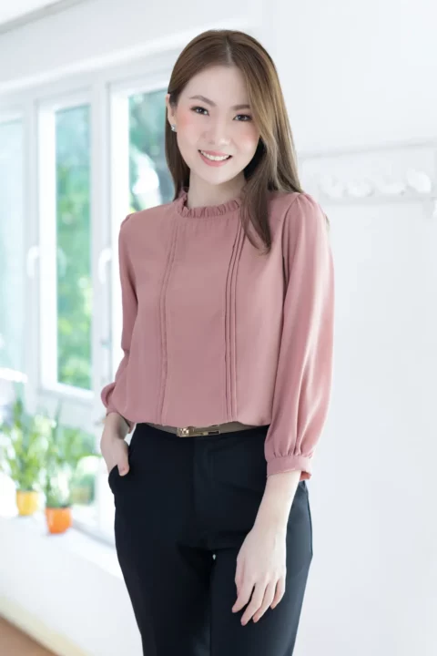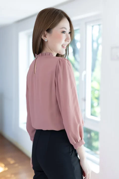 เสื้อทรงหวานมาแบบเรียบหรู แขนสี่ส่วนสุภาพ ใส่ได้หลายโอกาส คอจีบตั้งนิดๆ แต่งเกล็ดยาวด้านหน้า ใช้ผ้าชีฟองเนื้อทิ้งตัวสัมผัสดี คอด้านหลังผ่าหยดน้ำสั้นๆติดกระดุม สวมใส่สะดวก
