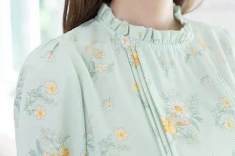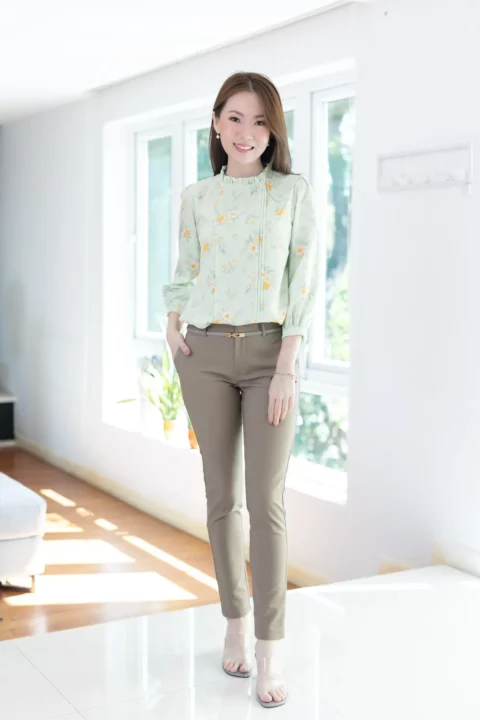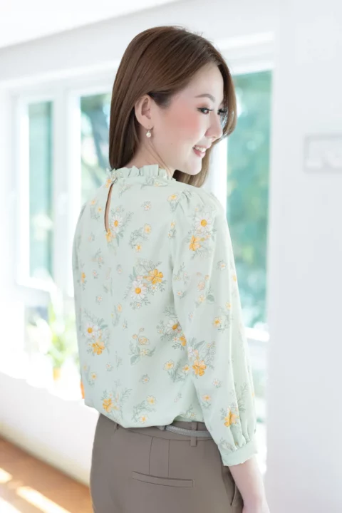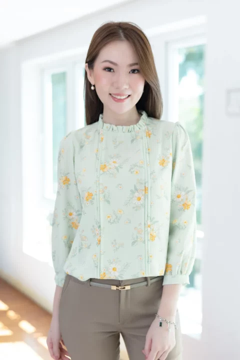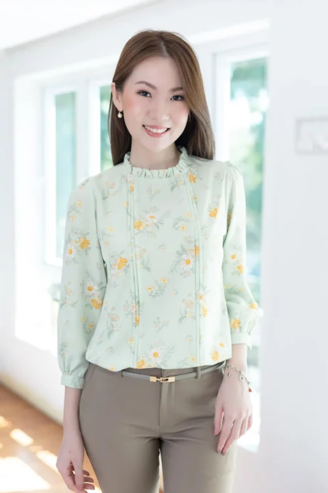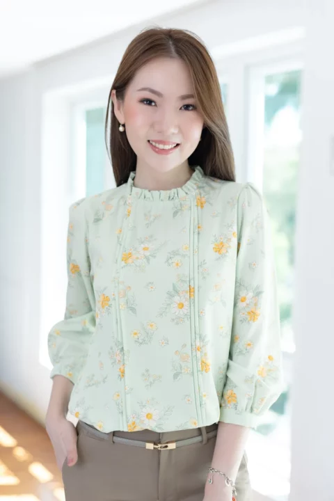 เสื้อทรงหวานมาแบบเรียบหรู แขนสี่ส่วนสุภาพ ใส่ได้หลายโอกาส คอจีบตั้งนิดๆ แต่งเกล็ดยาวด้านหน้า ใช้ผ้าไหมอิตาลี เนื้อเนียน พิมพ์ลายดอกไม้ คอด้านหลังผ่าหยดน้ำสั้นๆติดกระดุม สวมใส่สะดวก