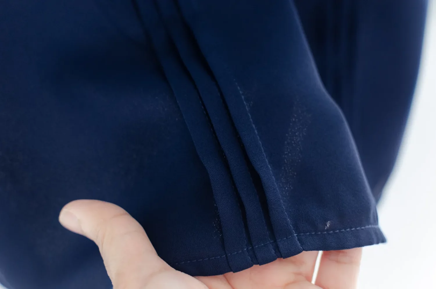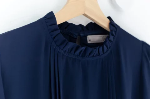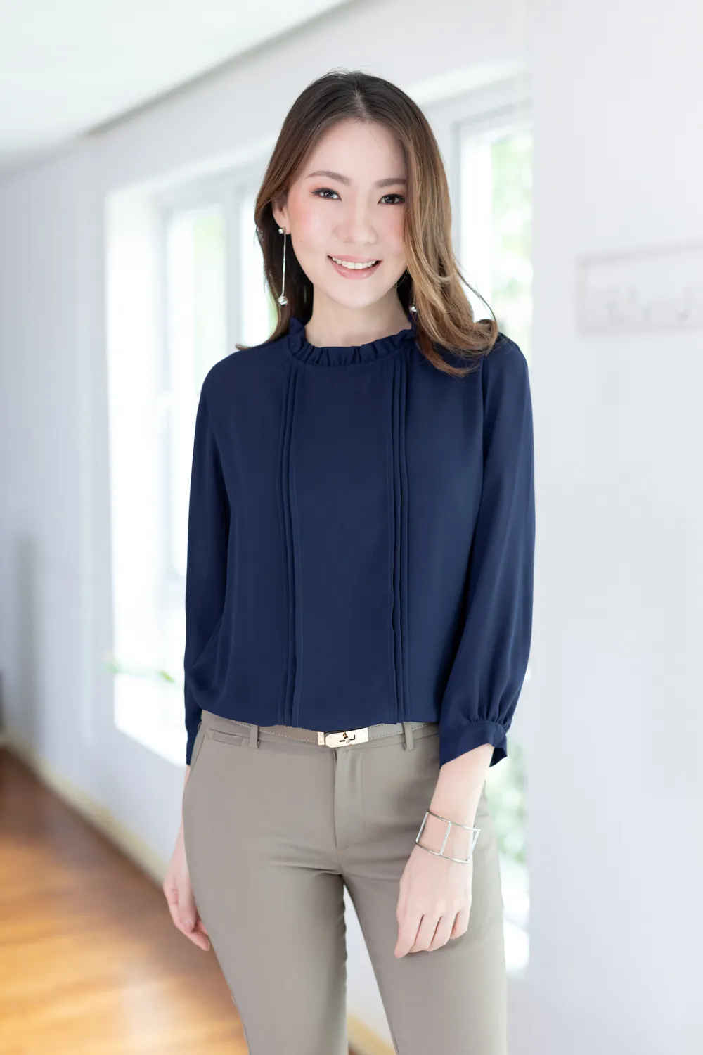 เสื้อทรงหวานมาแบบเรียบหรู แขนสี่ส่วนสุภาพ ใส่ได้หลายโอกาส คอจีบตั้งนิดๆ แต่งเกล็ดยาวด้านหน้า ใช้ผ้าชีฟองเนื้อทิ้งตัวสัมผัสดี คอด้านหลังผ่าหยดน้ำสั้นๆติดกระดุม สวมใส่สะดวก
