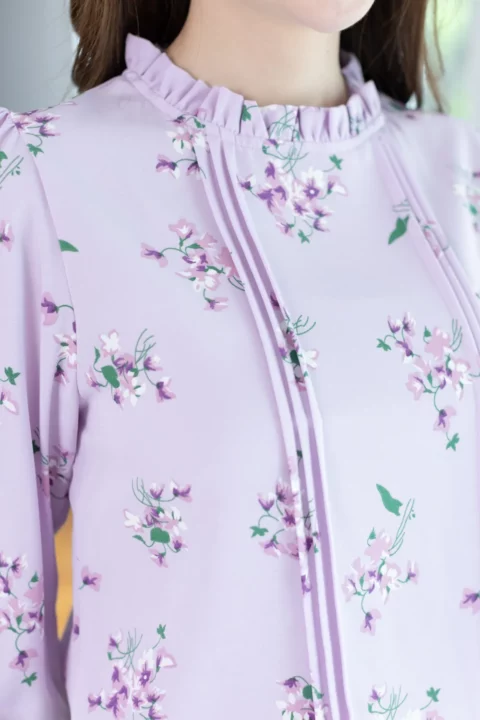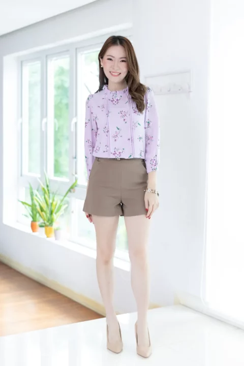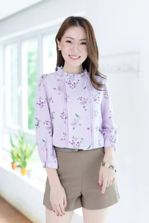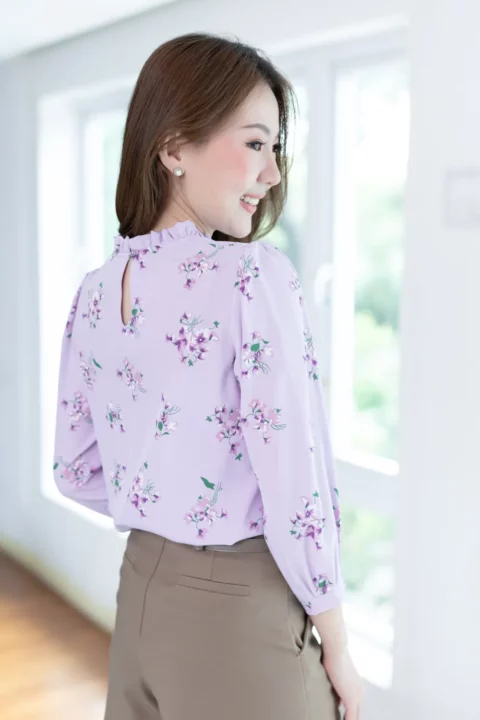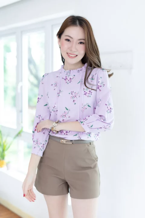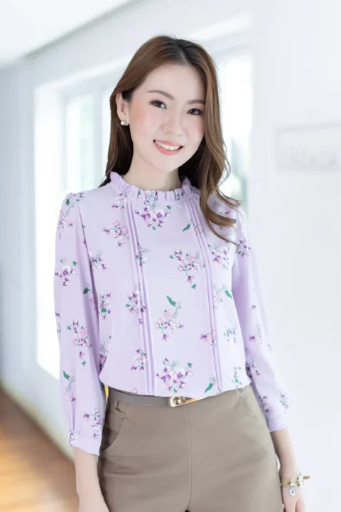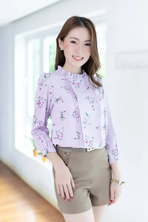 เสื้อทรงหวานมาแบบเรียบหรู แขนสี่ส่วนสุภาพ ใส่ได้หลายโอกาส คอจีบตั้งนิดๆ แต่งเกล็ดยาวด้านหน้า ใช้ผ้าไหมอิตาลี เนื้อเนียน พิมพ์ลายดอกไม้ คอด้านหลังผ่าหยดน้ำสั้นๆติดกระดุม สวมใส่สะดวก