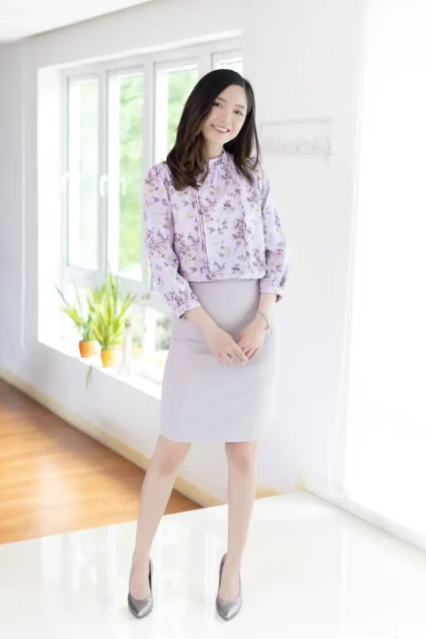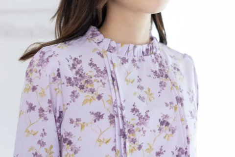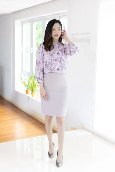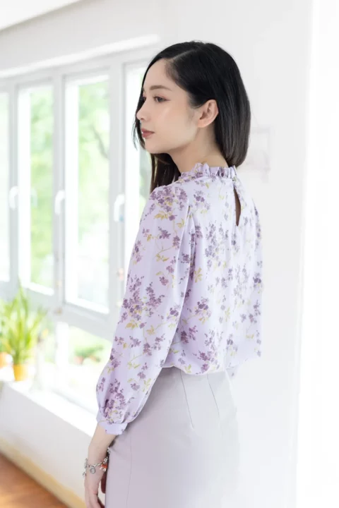 เสื้อทรงหวานมาแบบเรียบหรู แขนสี่ส่วนสุภาพ ใส่ได้หลายโอกาส คอจีบตั้งนิดๆ แต่งเกล็ดยาวด้านหน้า ใช้ผ้าไหมอิตาลี เนื้อเนียน พิมพ์ลายดอกไม้ คอด้านหลังผ่าหยดน้ำสั้นๆติดกระดุม สวมใส่สะดวก