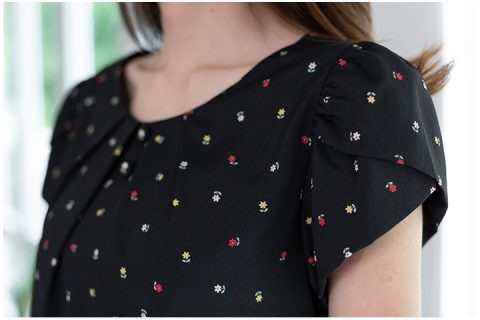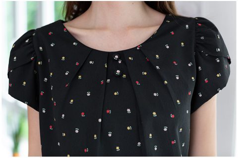 เสื้อทรงคอกลมปาด จับจีบรอบคอ ประดับกระดุมปั๊มคู่ด้านหน้า แขนซ้อนกลีบดอกไม้ใช้วิธีม้วนทบผ้า เอฟเฟคที่ได้คือความนุ่มนวลของปลายแขน จีบไหล่ดูหวานๆเป็นทรง ผ้าพิมพ์ลายดอกไม้จิ๋ว น่ารักน่าหยิก จะน่ารักกว่านี้ไม่ได้แล้วนะ!