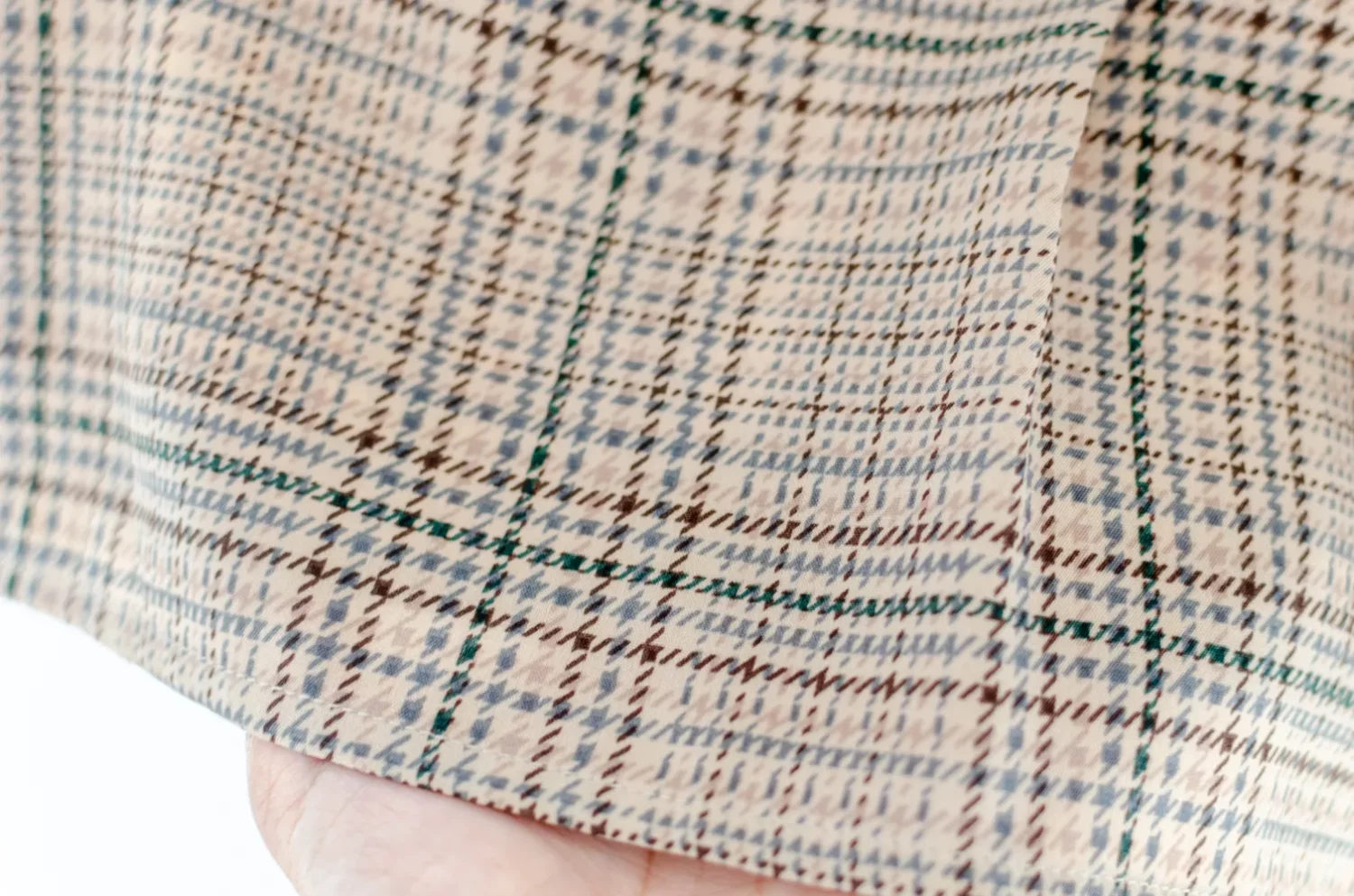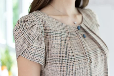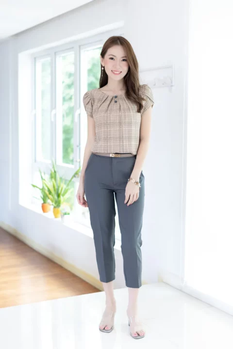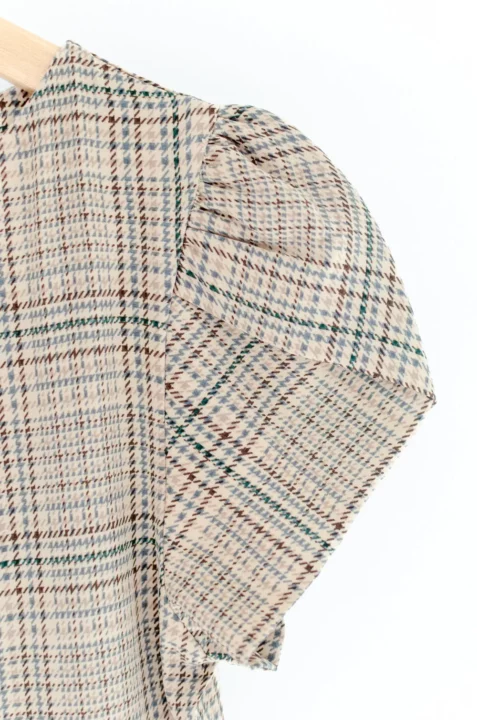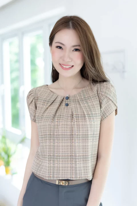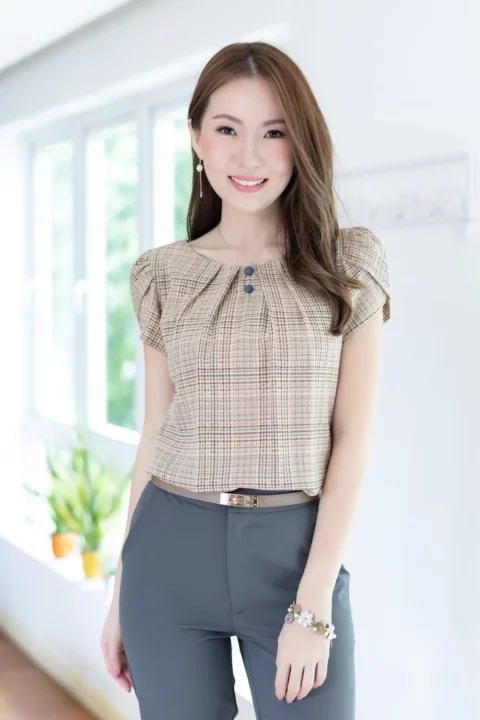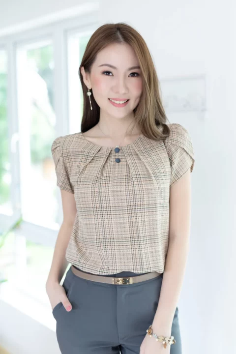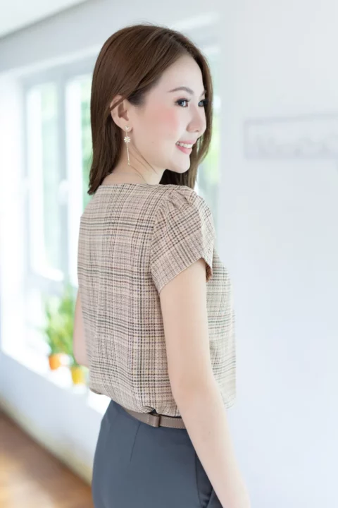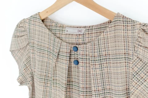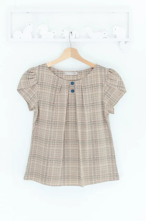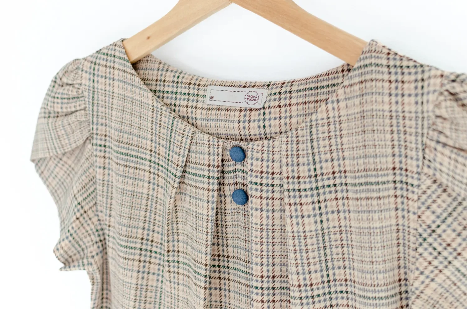 เสื้อทรงคอกลมปาด จับจีบรอบคอ ประดับกระดุมปั๊มด้านหน้า ตัดกันกับลายผ้า แขนซ้อนกลีบดอกไม้ใช้วิธีม้วนทบผ้า เอฟเฟคที่ได้คือความนุ่มนวลของปลายแขน จีบไหล่ดูหวานๆเป็นทรง ผ้าพิมพ์ลายตาราง จะน่ารักกว่านี้ไม่ได้แล้วนะ!