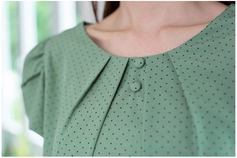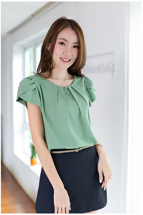 เสื้อทรงคอกลมปาด จับจีบรอบคอ ประดับกระดุมปั๊มคู่ด้านหน้า แขนซ้อนกลีบดอกไม้ใช้วิธีม้วนทบผ้า เอฟเฟคที่ได้คือความนุ่มนวลของปลายแขน จีบไหล่ดูหวานๆเป็นทรง ผ้าพิมพ์ลายจุดเล็กๆ จะน่ารักกว่านี้ไม่ได้แล้วนะ!