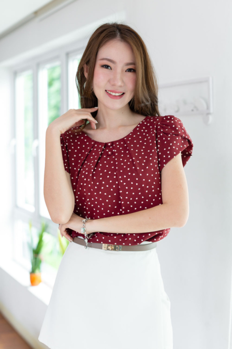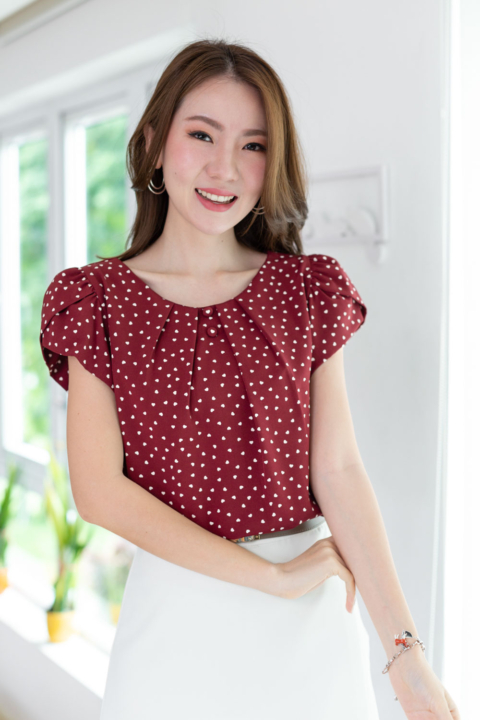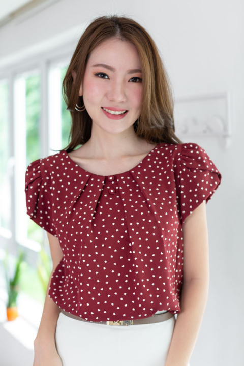 เสื้อทรงคอกลมปาด จับจีบรอบคอ ประดับกระดุมปั๊มคู่ด้านหน้า แขนซ้อนกลีบดอกไม้ใช้วิธีม้วนทบผ้า เอฟเฟคที่ได้คือความนุ่มนวลของปลายแขน จีบไหล่ดูหวานๆเป็นทรง ผ้าพิมพ์ลายหัวใจเล็กๆ จะน่ารักกว่านี้ไม่ได้แล้วนะ!