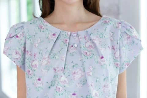 เสื้อทรงคอกลมปาด จับจีบรอบคอ ประดับกระดุมปั๊มคู่ด้านหน้า แขนซ้อนกลีบดอกไม้ใช้วิธีม้วนทบผ้า เอฟเฟคที่ได้คือความนุ่มนวลของปลายแขน จีบไหล่ดูหวานๆเป็นทรง ผ้าพิมพ์ลายดอกกุหลาบ จะน่ารักกว่านี้ไม่ได้แล้วนะ!