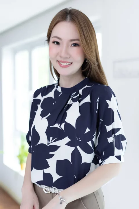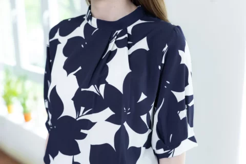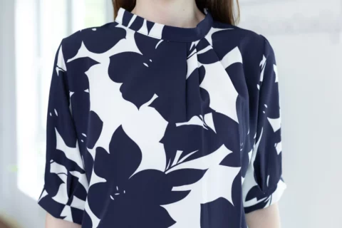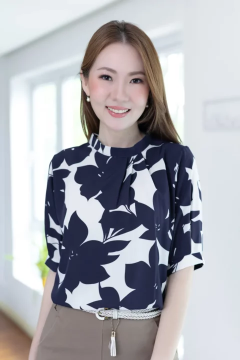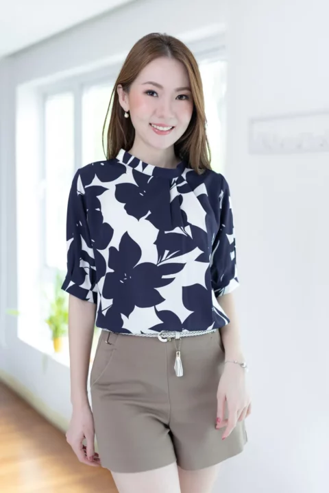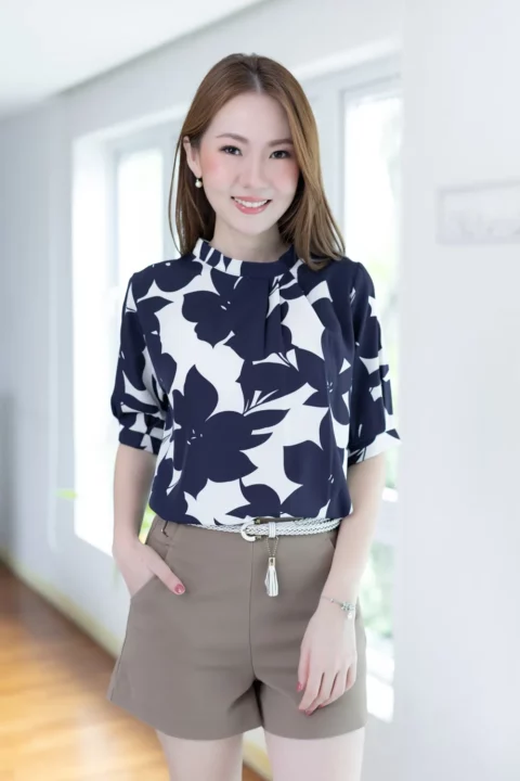 เสื้อทรงเรียบร้อย คอปิดตั้งนิดๆแต่งจีบซ้อนกันใต้คอฝั่งซ้าย ต่อแขนตุ๊กตา รุ่นนี้แขนยาวกว่าปกติเกือบถึงช่วงศอก(ขึ้นอยู่กับสรีระ) ด้านหลังผ่าหยดน้ำติดกระดุม ทรงสุภาพใส่ไปทำงานได้ ทรงเสื้อไม่ยาวมากจับคู่กับเอวสูงจะกำลังพอดีค่ะ