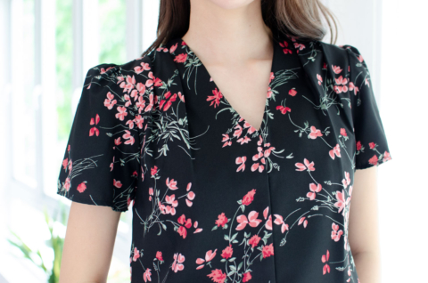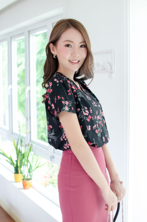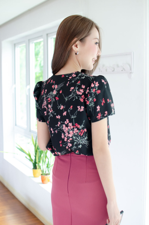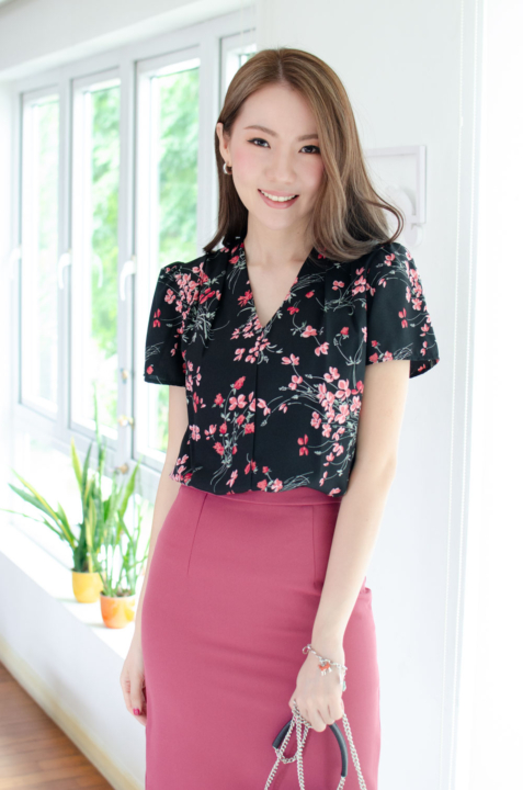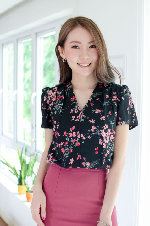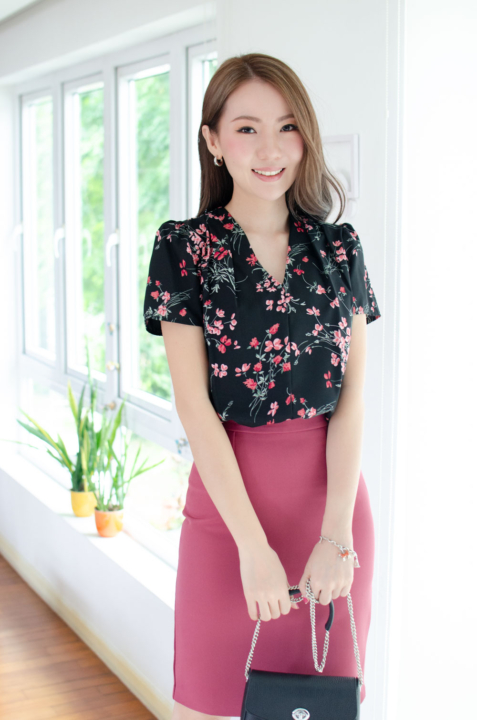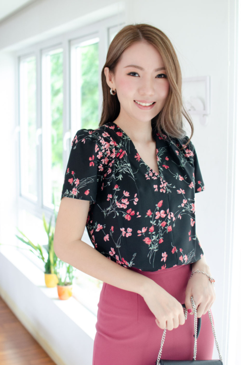 เสื้อทำงานคอวี ทรงสวยใส่แล้วผอม รุ่นนี้ใช้ผ้าอิตาลีเนื้อเนียน พิมพ์ลายดอกไม้ ต่อแขนกระบอก จับจีบบ่าและต้นแขนเบาๆ คลาสสิกแบบเก๋ไก๋ ใส่ได้ตลอดกาลจริงๆค่าา