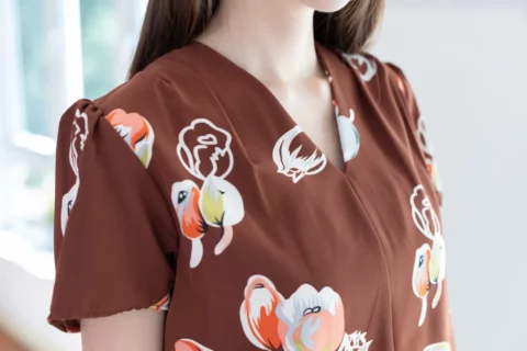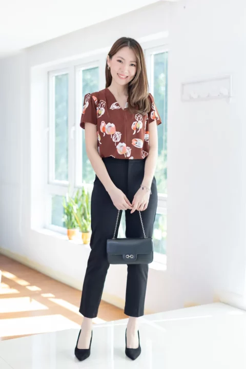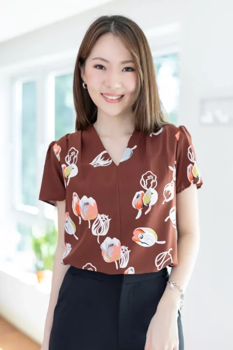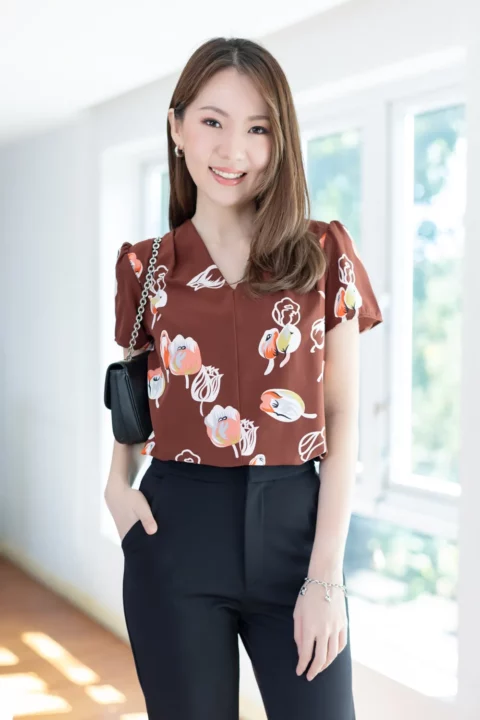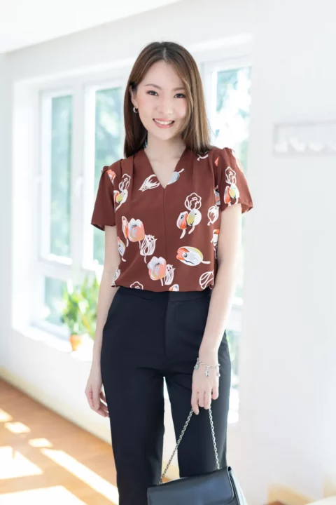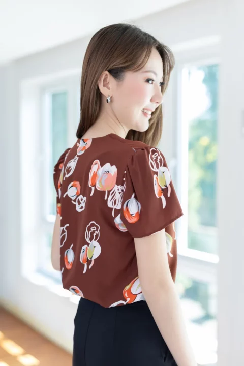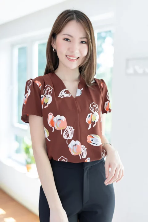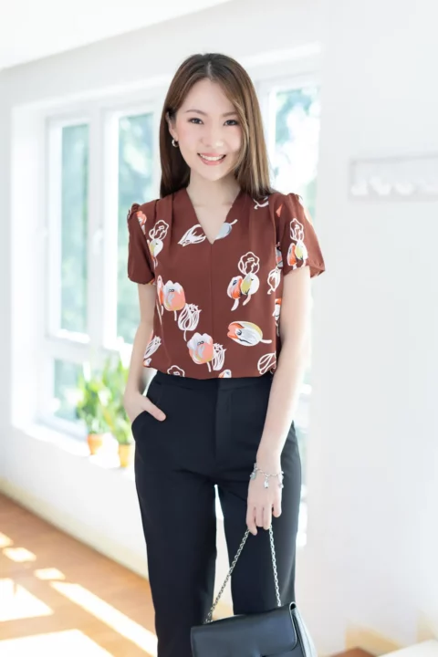 เสื้อทำงานคอวี ทรงสวยใส่แล้วผอม ผ้าไหมอิตาลีเนียนๆพิมพ์ลายดอกทิวลิป ต่อแขนกระบอก จับจีบบ่าและต้นแขนเบาๆ คลาสสิกแบบละมุนละไม ใส่ได้ตลอดกาลจริงๆค่าา