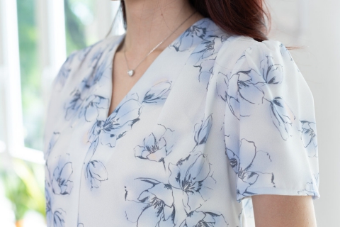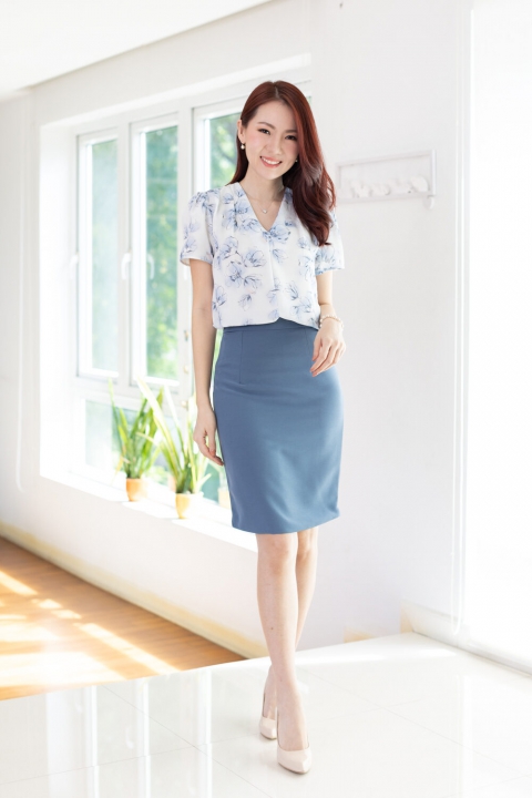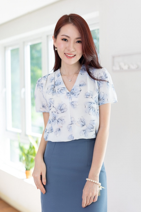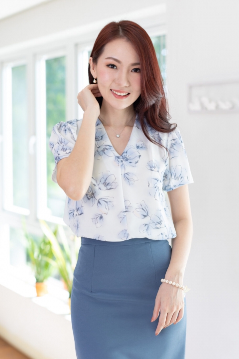 เสื้อทำงานคอวี ทรงสวยใส่แล้วผอม ผ้าสีฟ้าจางๆพิมพ์ลายดอกไม้ ต่อแขนกระบอก จับจีบบ่าและต้นแขนเบาๆ คลาสสิกแบบเก๋ไก๋ ใส่ได้ตลอดกาลจริงๆค่าา