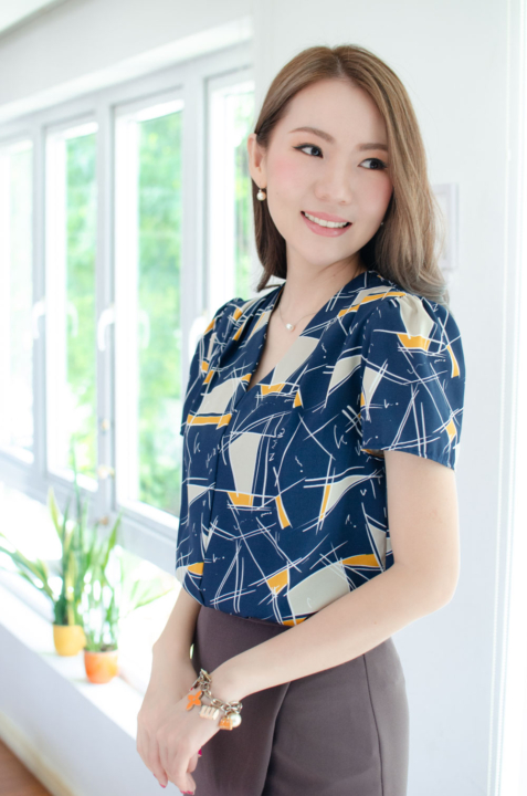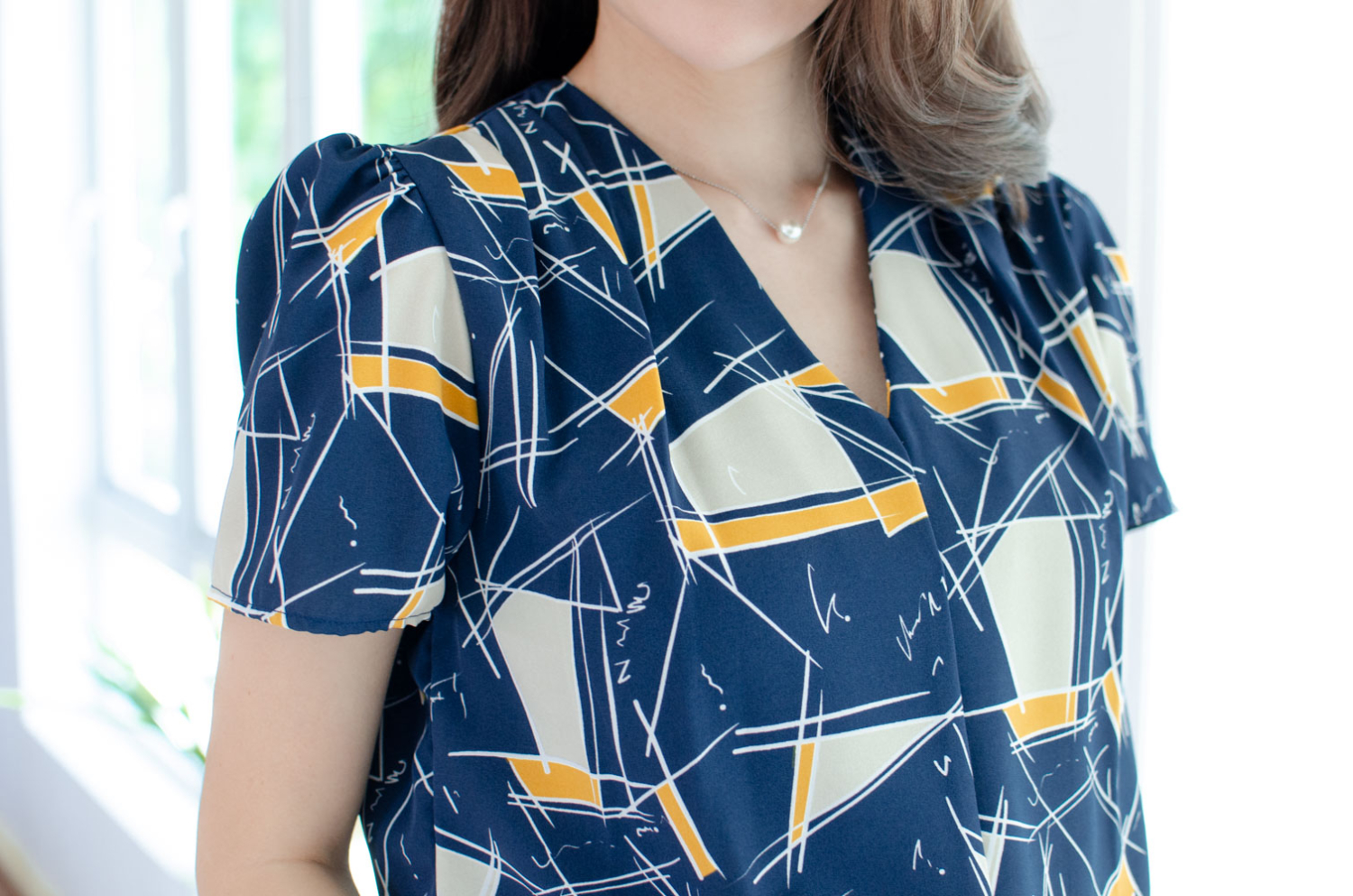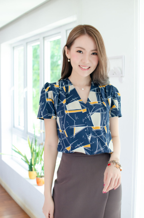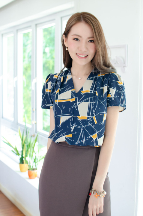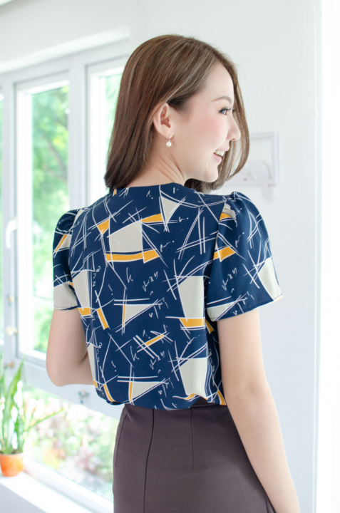 MT0601 V-Collar Graphic Print Blouse – Navy Blue