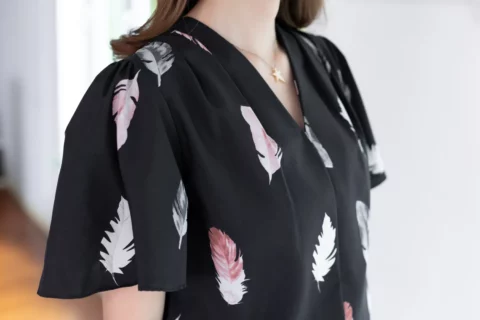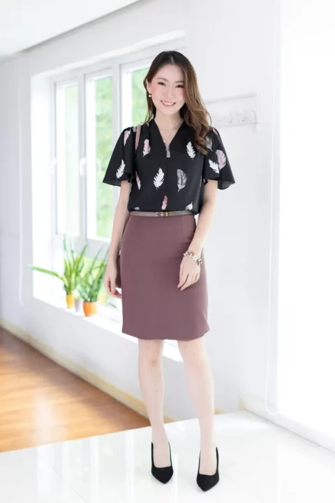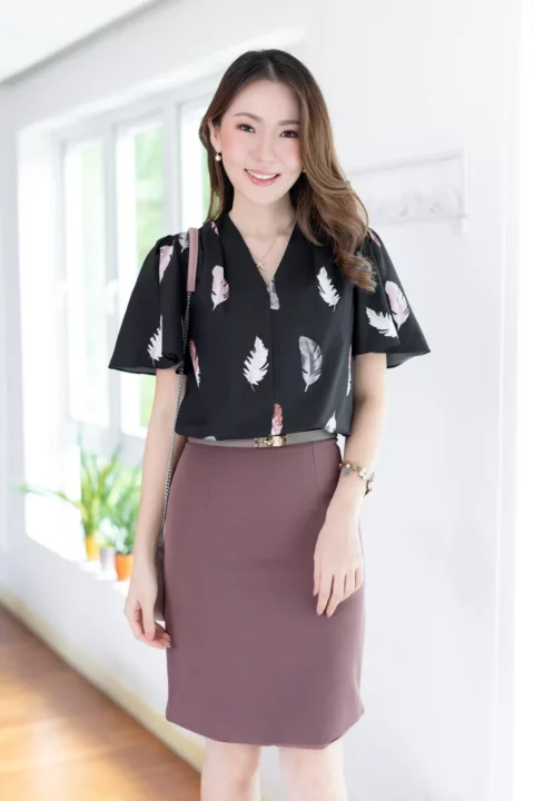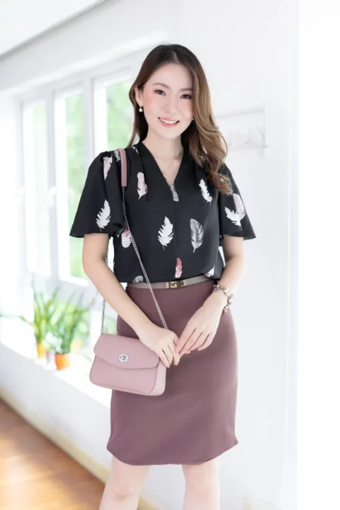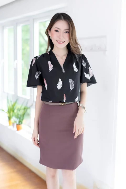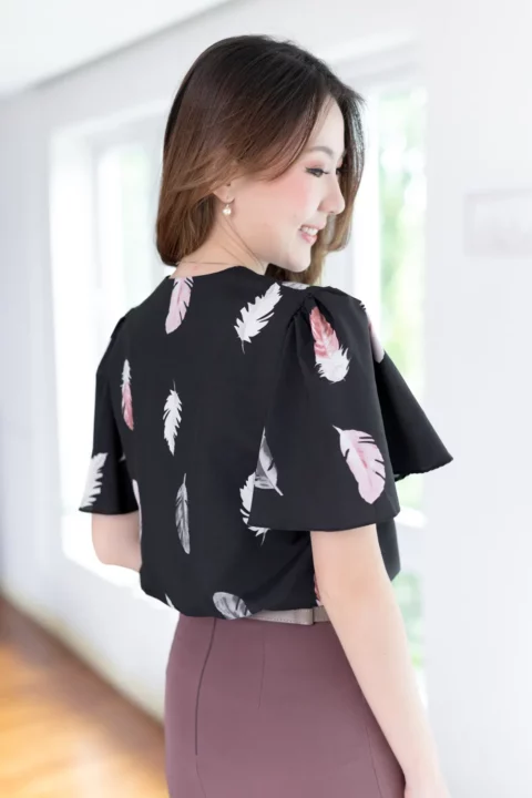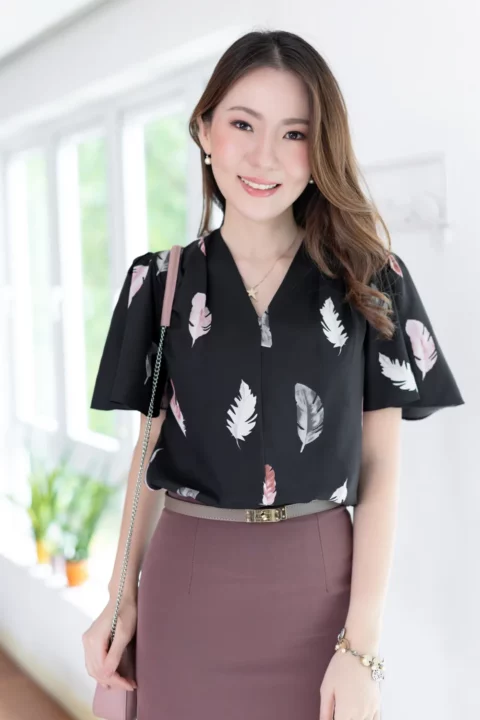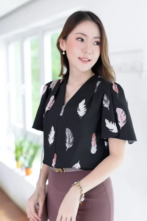 เสื้อทำงานคอวี จับจีบบ่าและต้นแขนเบาๆ แขนผีเสื้อพลิ้วทิ้งตัวสวยคลุม ต้นแขน เนื้อผ้าไหมอิตาลีเนียนนวล ลายพิมพ์ขนนก ทรงคลาสสิคใส่ได้หลายโอกาส