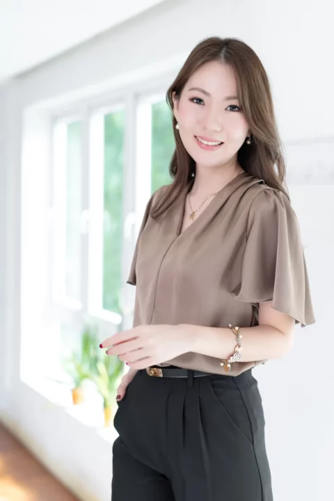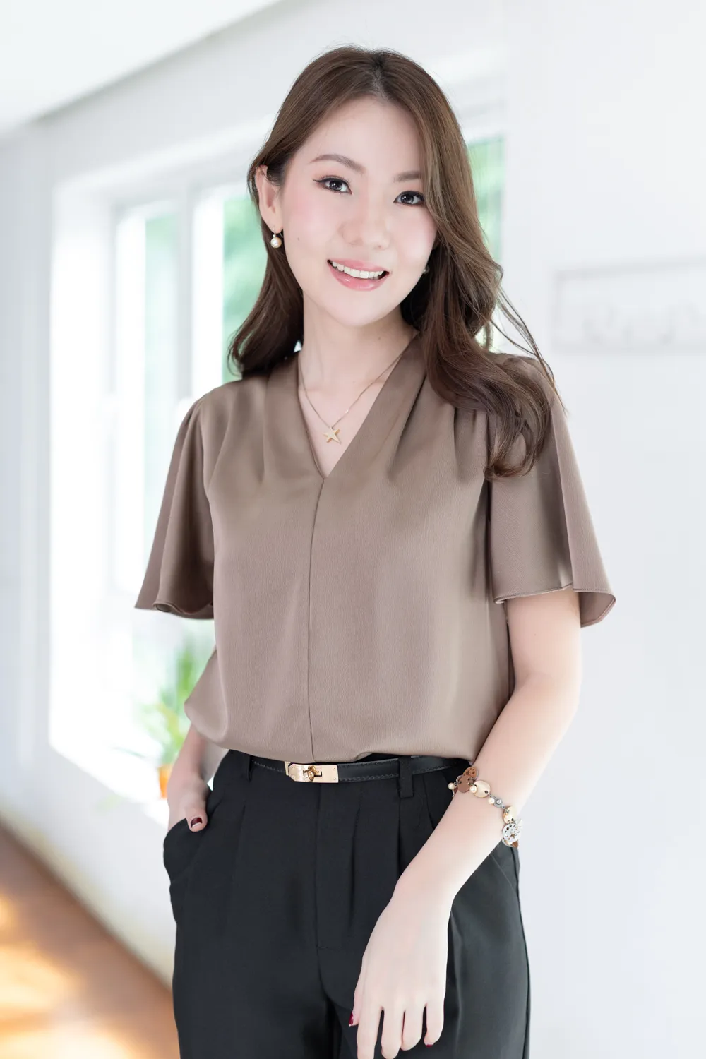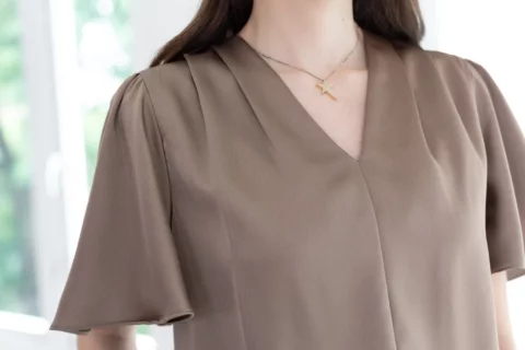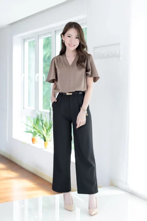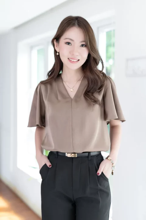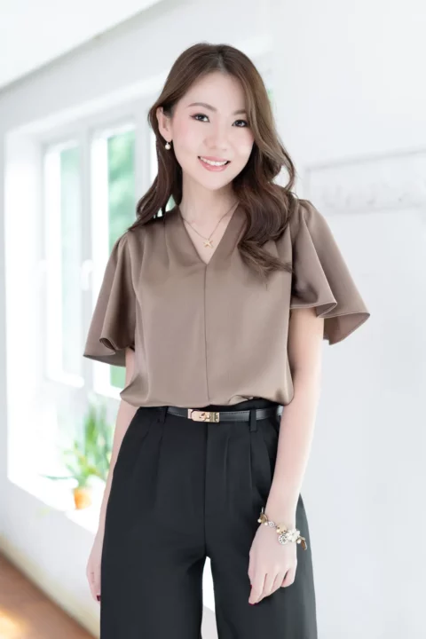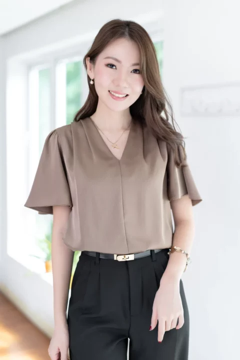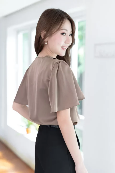 เสื้อทำงานคอวี จับจีบบ่าและต้นแขนเบาๆ แขนผีเสื้อพลิ้วสวยปิดต้นแขน เนื้อผ้าวาวสวย คลาสสิคใส่ได้หลายโอกาส