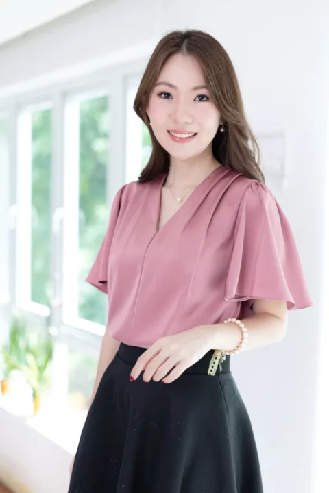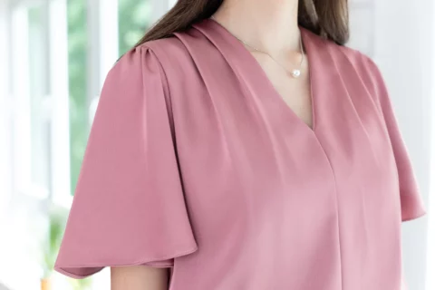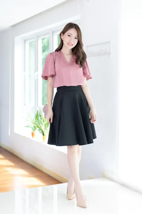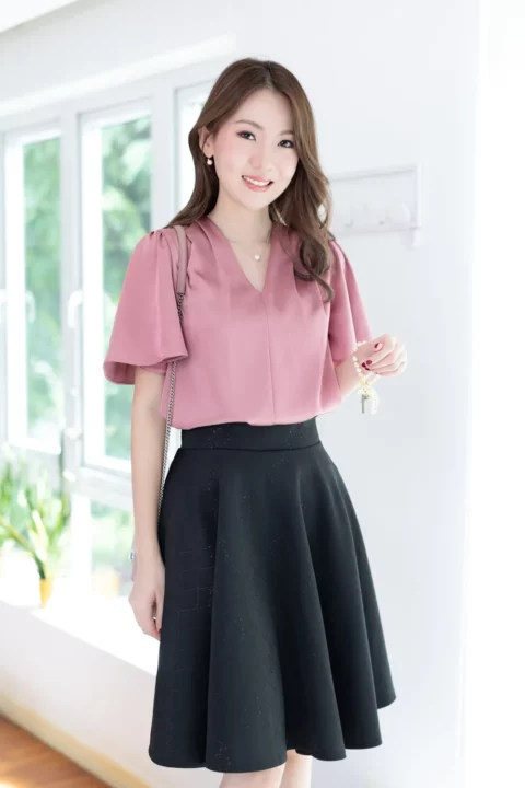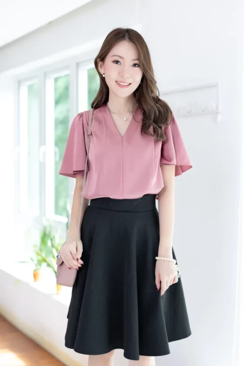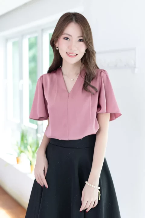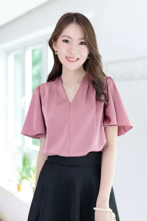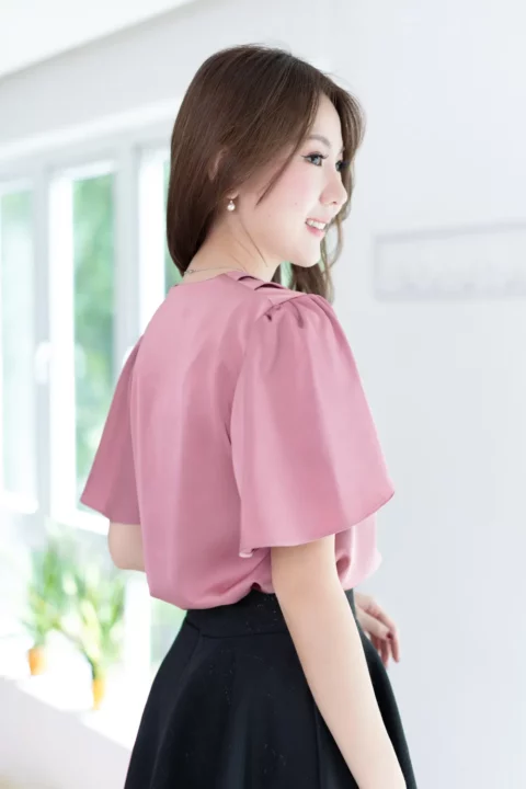 เสื้อทำงานคอวี จับจีบบ่าและต้นแขนเบาๆ แขนผีเสื้อพลิ้วสวยปิดต้นแขน เนื้อผ้าวาวสวย คลาสสิคใส่ได้หลายโอกาส