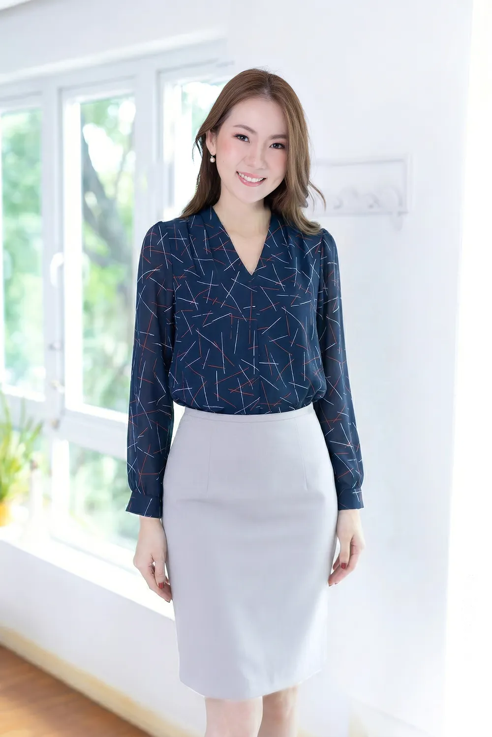 เสื้อทำงานคอวี ทรงสวยใส่แล้วผอม ต่อแขนยาว จับจีบบ่าและต้นแขนเบาๆ เนื้อผ้าเนียนลื่นไม่หนา คลาสสิกแบบละมุนละไม ใส่ได้ตลอดกาลจริงๆค่าา