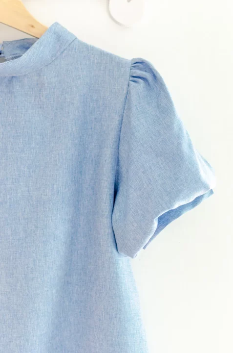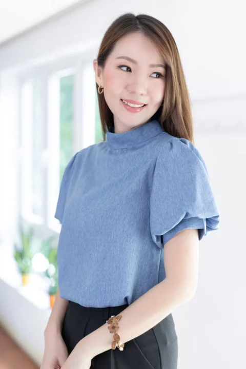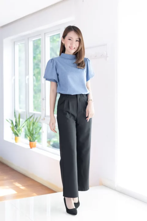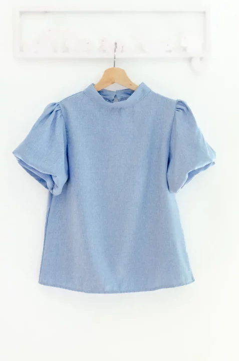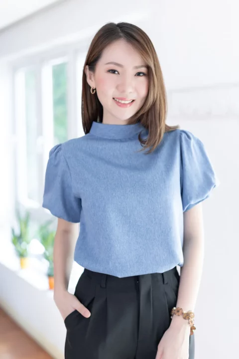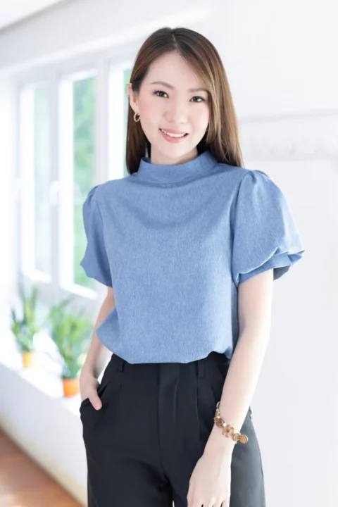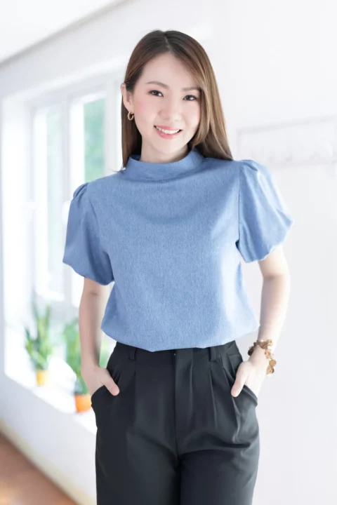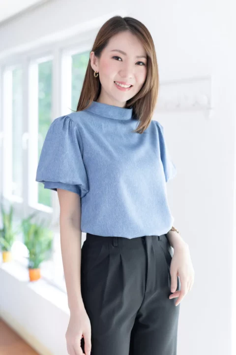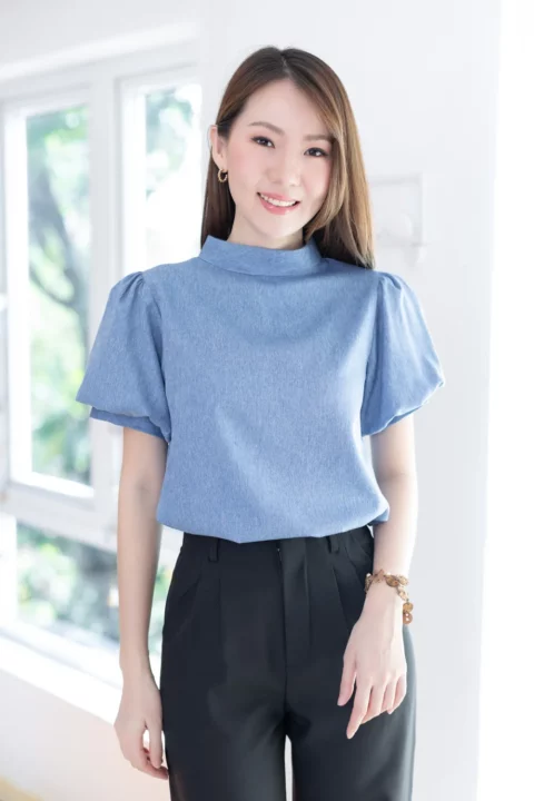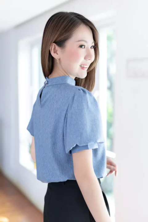 เสื้อคอปิดขอบตั้งๆ ผ้านิ่มเนียน สัมผัสดีสุดๆ ทรงคลาสสิค แขนทรงบอลลูนพองกำลังสวย ด้านหลังเจาะหยดน้ำติดกระดุม งานดีงาม
