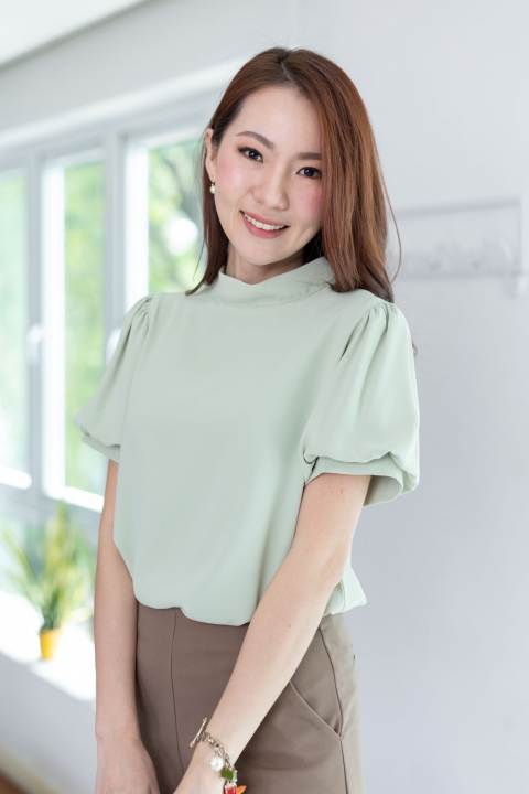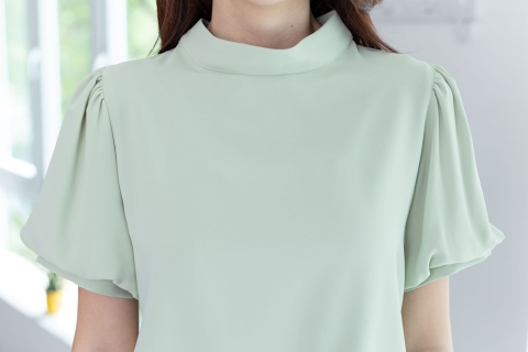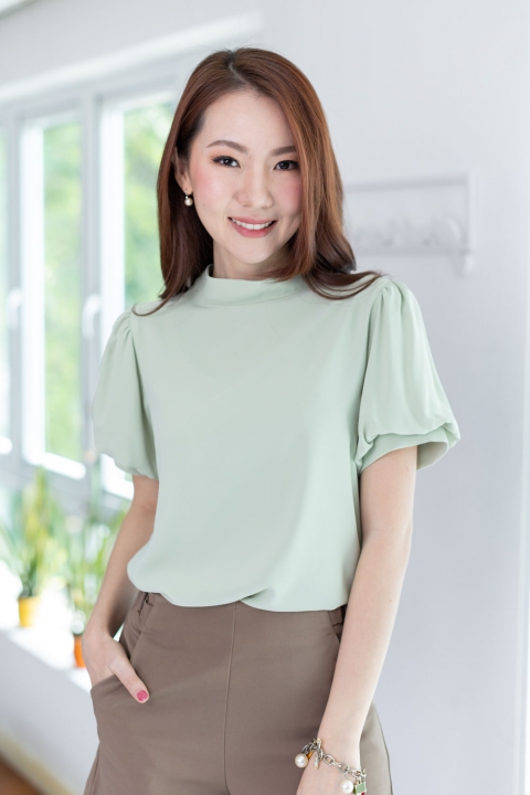 เสื้อคอปิดขอบตั้งๆ สีพื้นเรียบโก้ เนื้อผ้าลื่นเนียน ไม่บาง แอบเด้งนิดๆ แขนทรงบอลลูนพองกำลังสวย ด้านหลังเจาะหยดน้ำติดกระดุม งานดีงาม