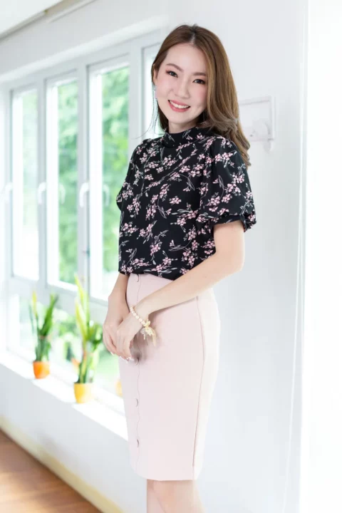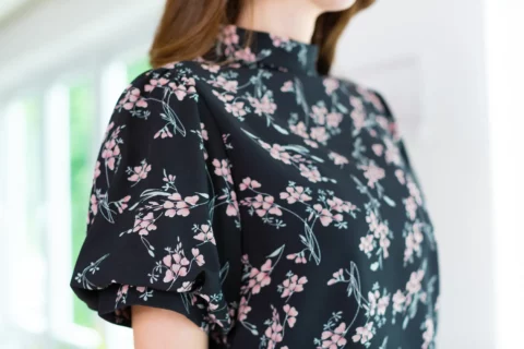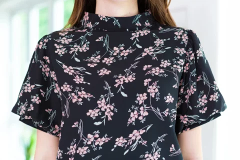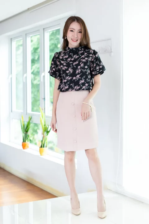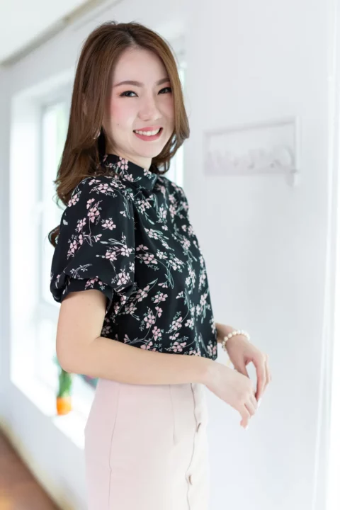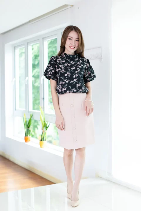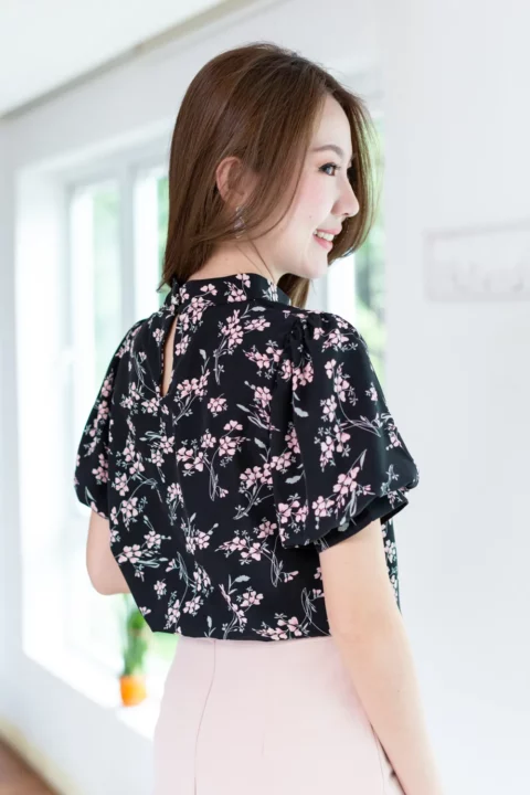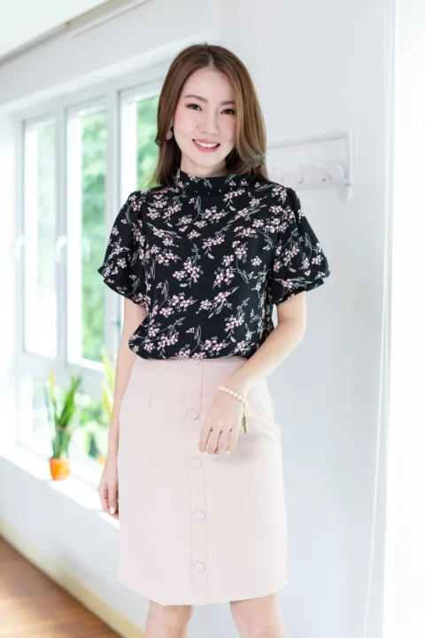 เสื้อคอปิดขอบตั้งๆ ใช้ผ้าอิตาลีเนื้อนิ่มมม พิมพ์ลายช่อดอกไม้ แขนทรงบอลลูนพองกำลังสวย ด้านหลังเจาะหยดน้ำติดกระดุม ลายสวยหวาน งานดีงาม