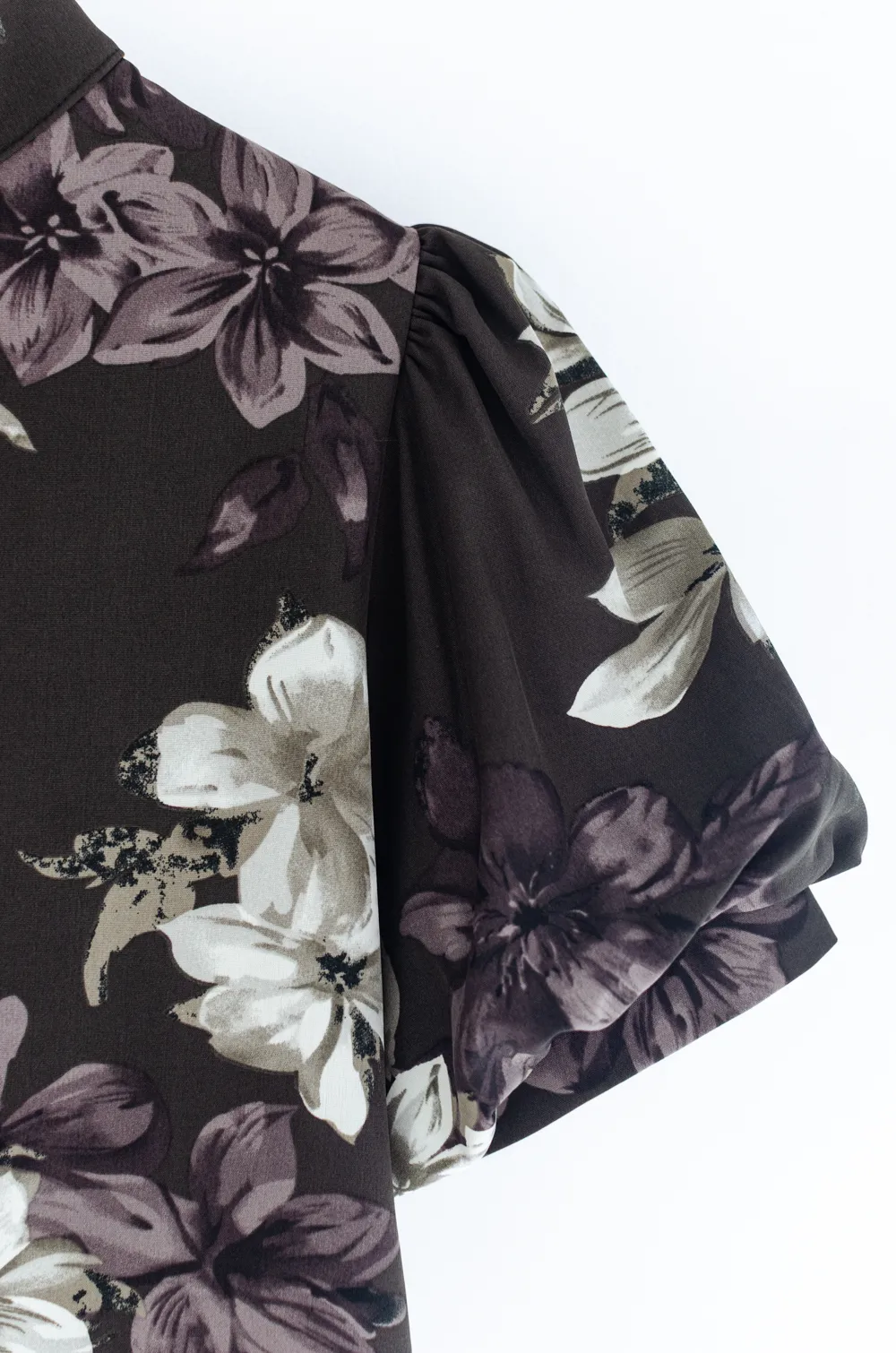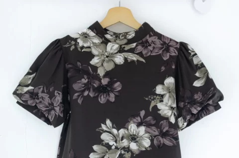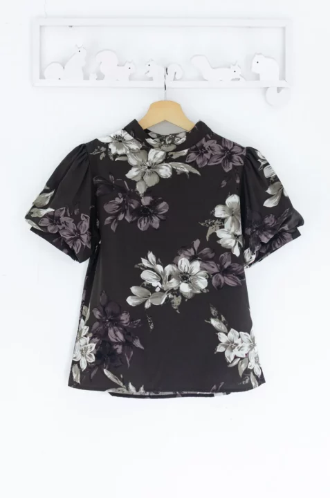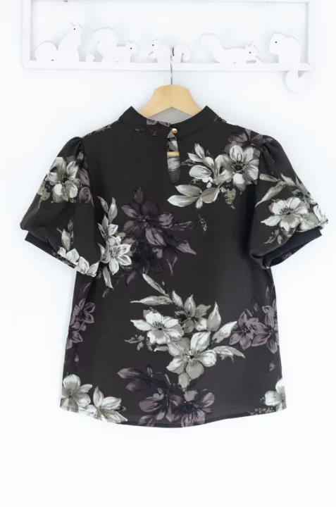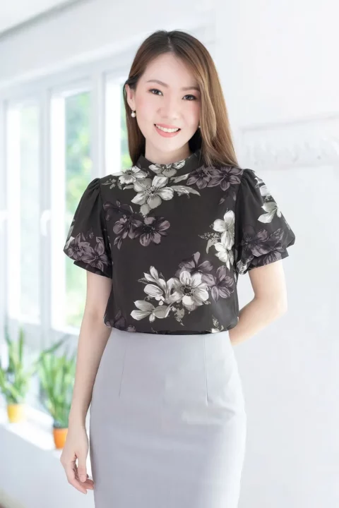 เสื้อคอปิดขอบตั้งๆ ใช้ผ้าเนื้อเนียนสบายผิว พิมพ์ลายดอกไม้ แขนทรงบอลลูนพองกำลังสวย ด้านหลังเจาะหยดน้ำติดกระดุม ลายสวยเก๋ งานดีงาม