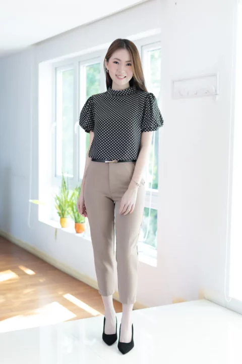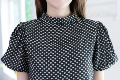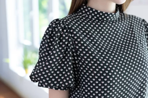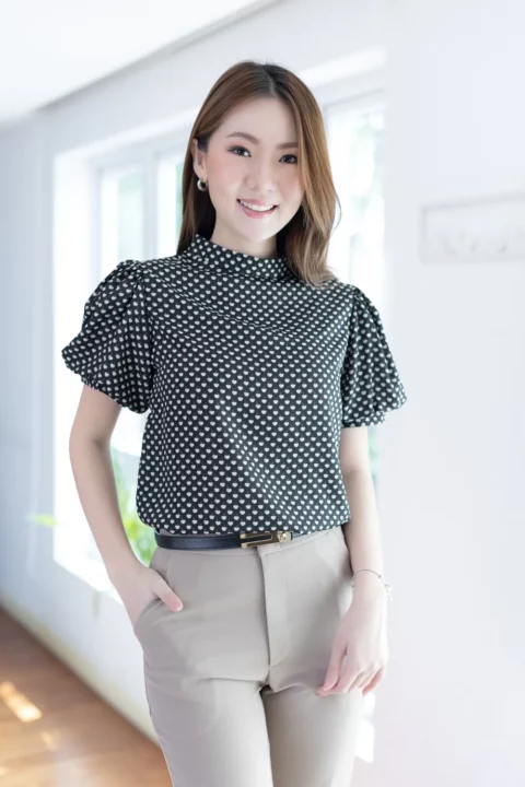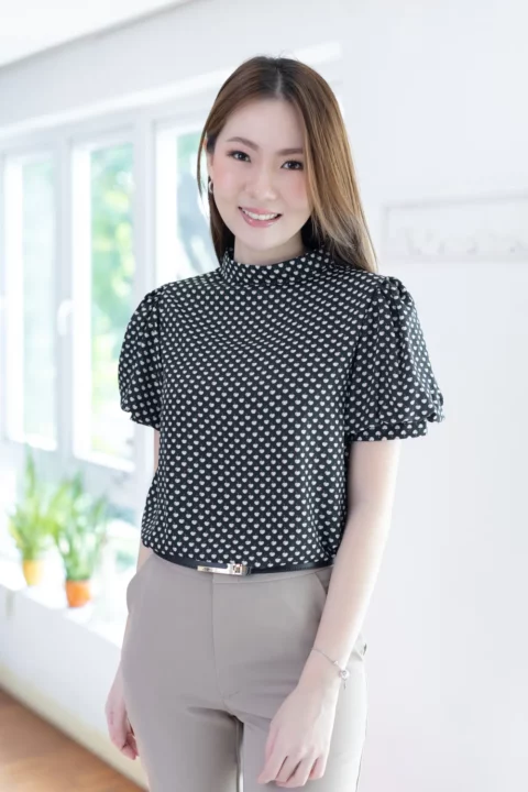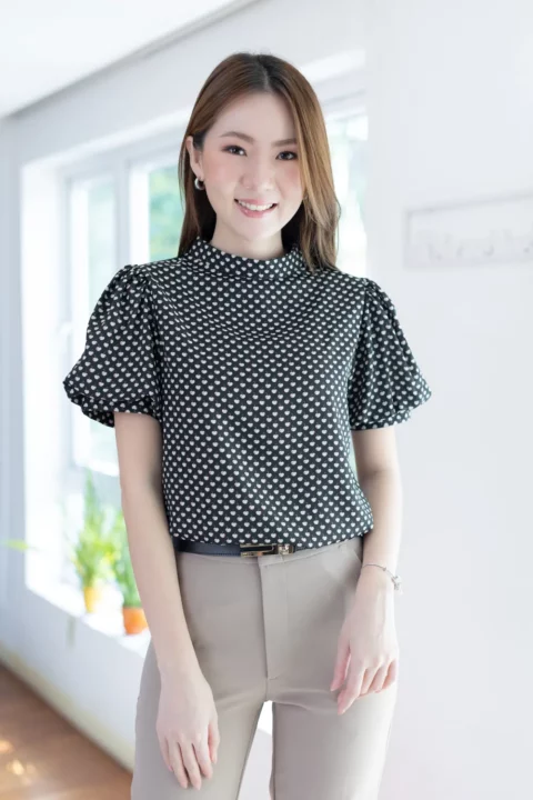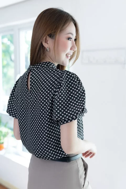เสื้อคอปิดขอบตั้งๆ ใช้ผ้าเนื้อเนียนสบายผิว พิมพ์ลายกราฟิกเชอร์รี่น่าร้ากกก แขนทรงบอลลูนพองกำลังสวย ด้านหลังเจาะหยดน้ำติดกระดุม ลายสวยเก๋ งานดีงาม