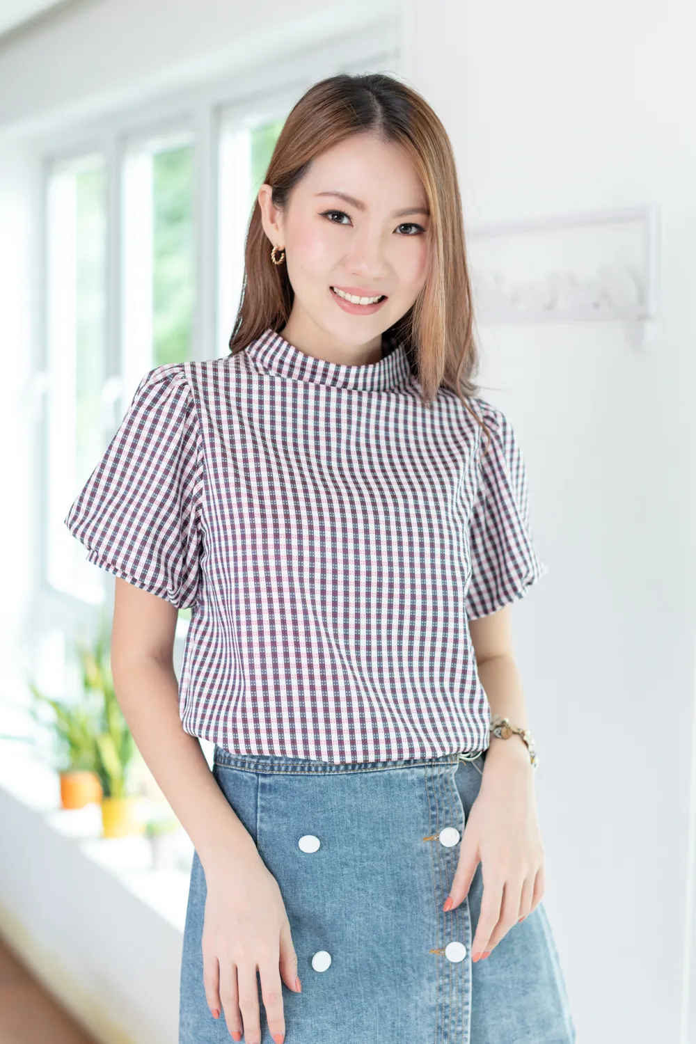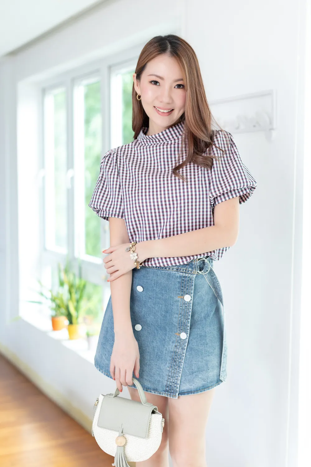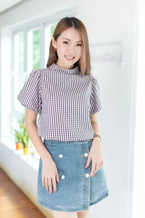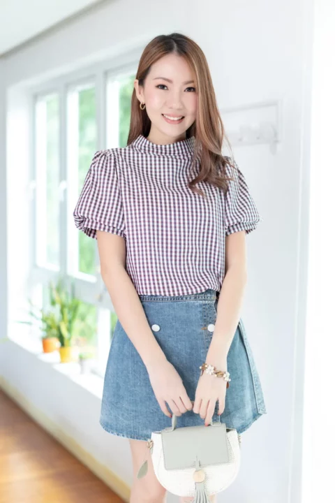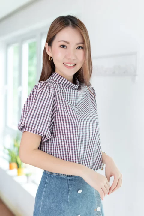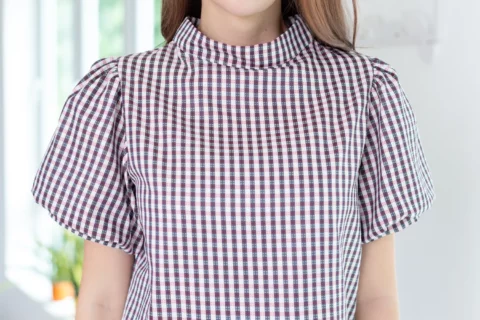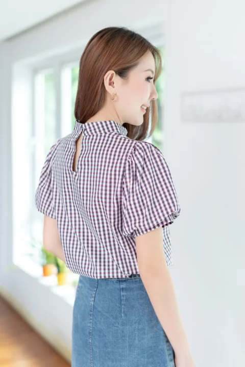 เสื้อคอปิดขอบตั้งๆ ผ้าทอลายตารางเนื้อสวยมากมี Textured ในตัว เนื้อไม่หนามาก ไม่บางเกินไป สัมผัสดีสุดๆ ทรงคลาสสิค แขนทรงบอลลูนพองกำลังสวย ด้านหลังเจาะหยดน้ำติดกระดุม งานดีงาม