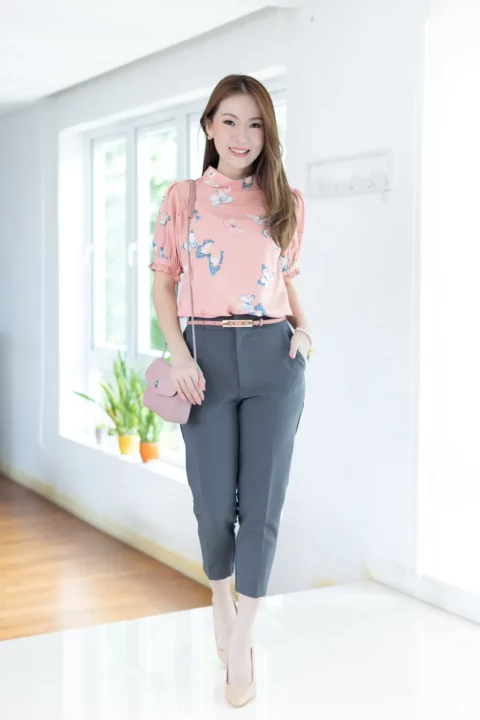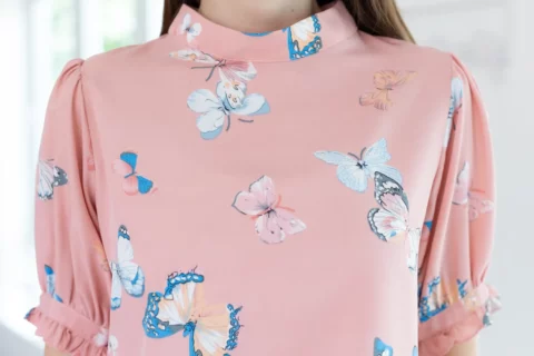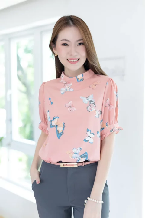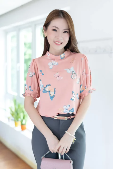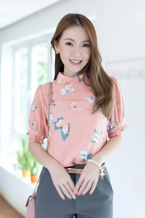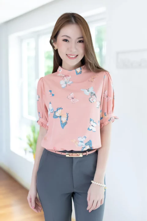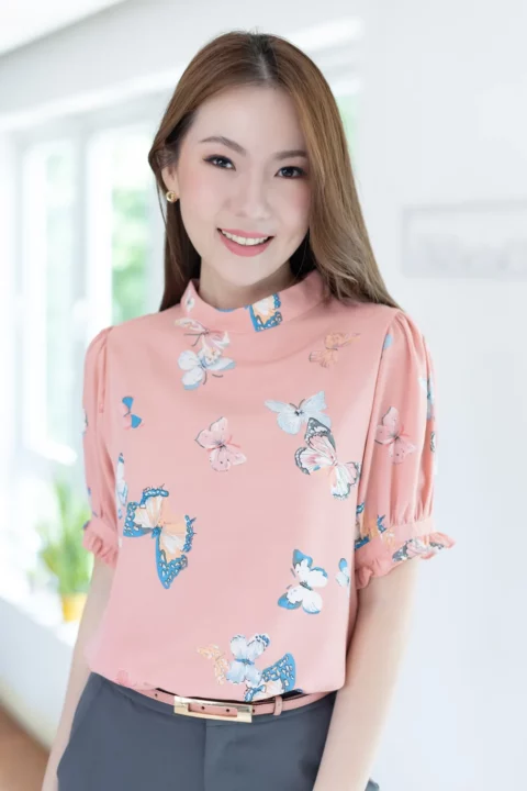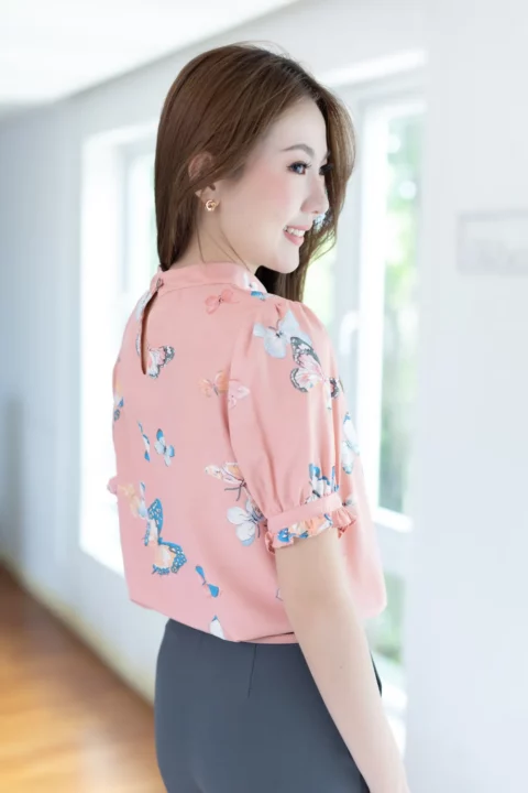 MT0732 Butterfly Band Collar Puff Sleeve Blouse – Pink
