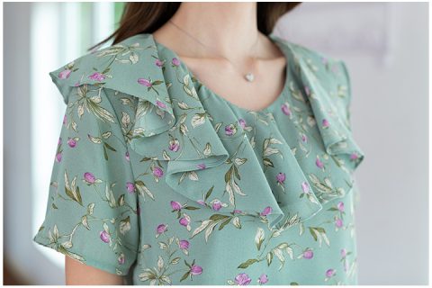 มาลองเสื้อมู้ดหวานสบายๆกันบ้างค่ะ ทรงคอกลม เสื้อเป็นแบบสวม แขนกระบอกสั้น จุดเด่นคืองานแต่งระบายรอบคอพลิ้ว ลายผ้าดอกไม้ ลุคทำงานแบบดูหวานเรียบร้อยออกแนวพลิ้วๆ สวยเรียบง่าย