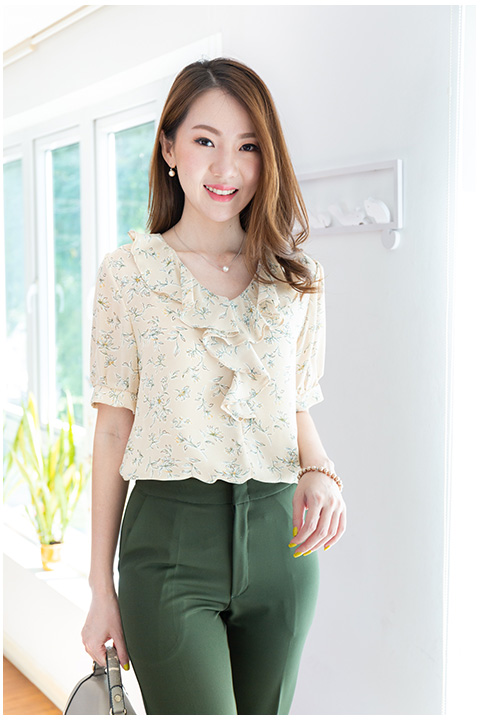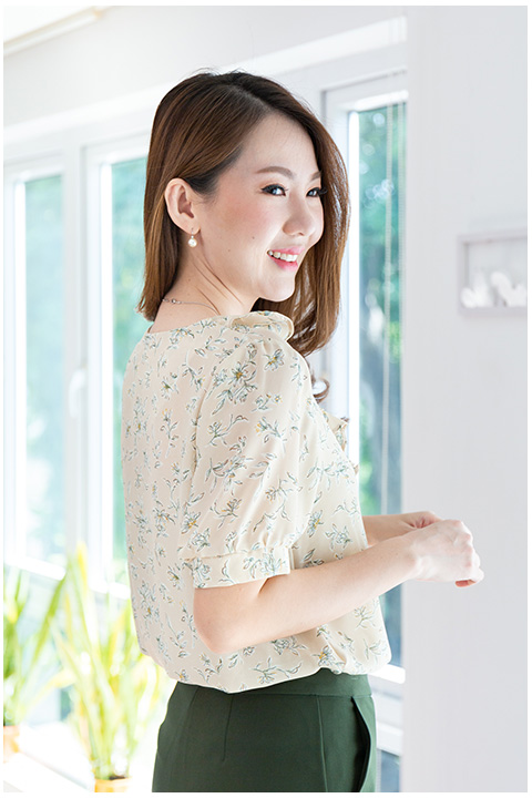 เสื้อทำงานสวยหวาน แต่งระบายช่วงคอ ทิ้งตัวยาวลงด้านหน้า งานพลิ้วๆผ้าทิ้งๆ ต่อแขนบอลลูนจับจีบแบบเบาๆ ผ้าเนียนนิ่ม ใส่สบายมากเลย