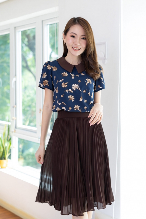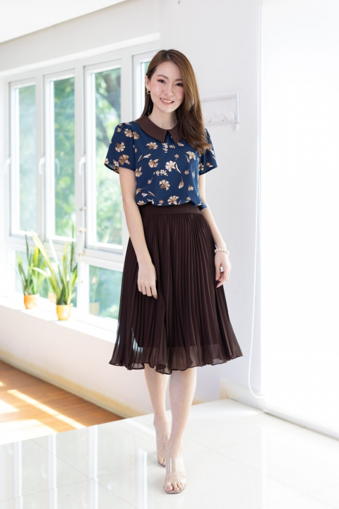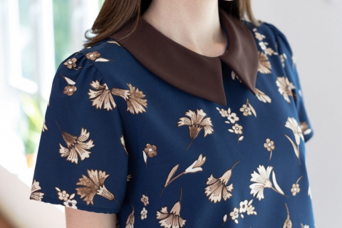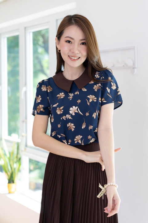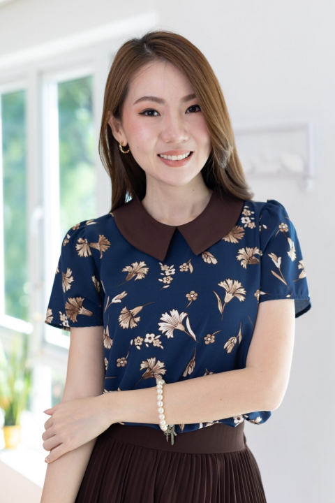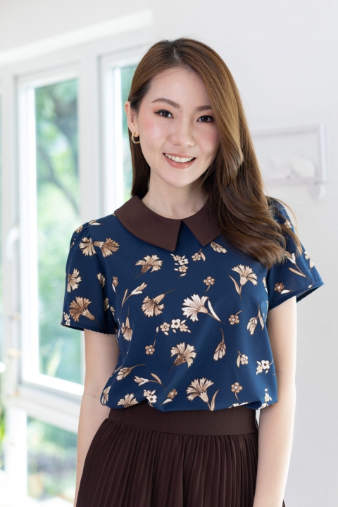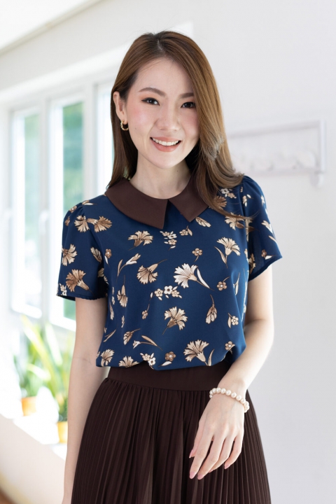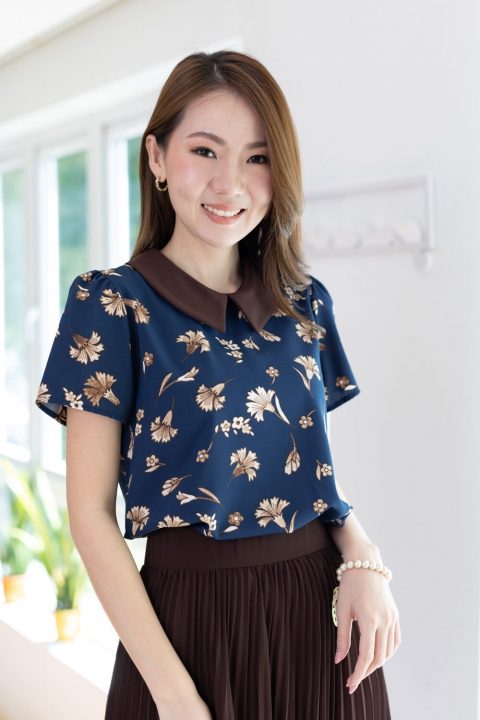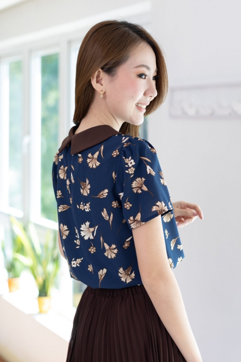 เสื้อทำงานเนื้อผ้านิ่มๆ รีดง่าย สีน้ำเงินสวย ต่อปกบัวตัดปลายแหลมสีพื้นน้ำตาลช็อคโกแลตเข้ม ตัวเสื้อพิมพ์ลายดอกไม้ แขนสั้นแบบใส่ง่าย ทรงมีปก สวยสุภาพ ใส่ได้เรื่อยๆเลยค่ะ
