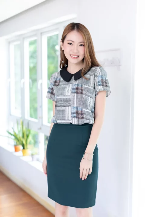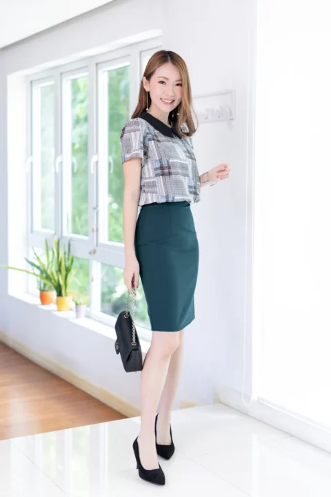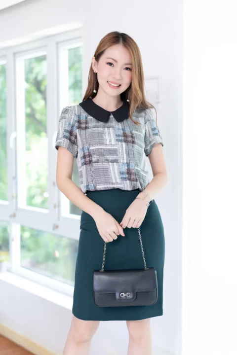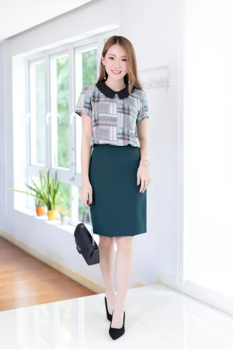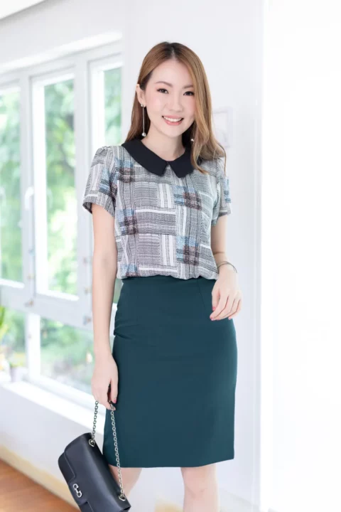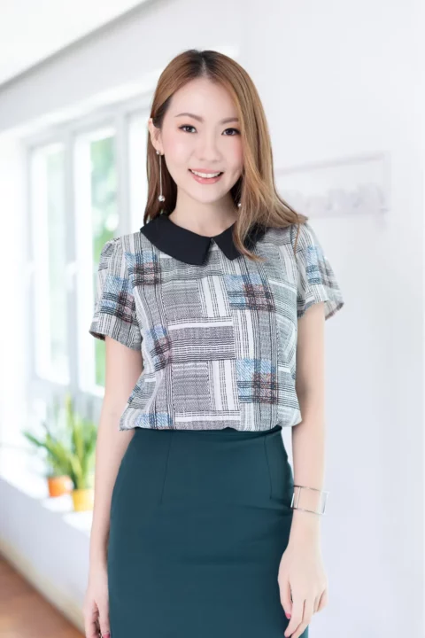 เสื้อทำงานเนื้ออิตาลี พิมพ์ลายกราฟิกตารางสีสวย ต่อปกบัวตัดปลายแหลมสีพื้น แขนสั้นแบบใส่ง่าย ทรงมีปกสวยสุภาพ ใส่ได้เรื่อยๆเลยค่ะ