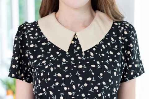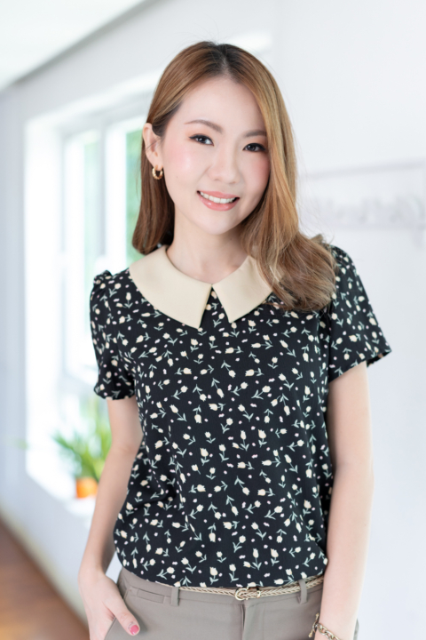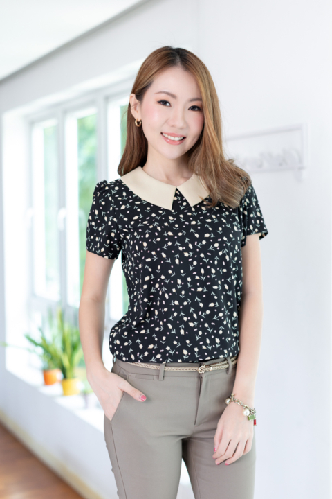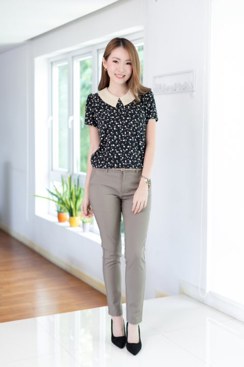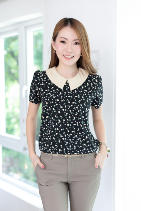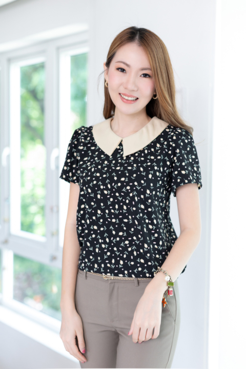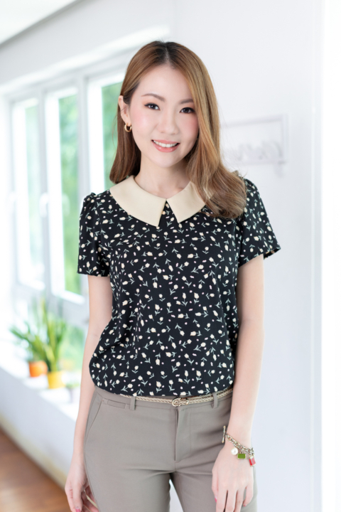 เสื้อทำงานเนื้อโพลีเอสเตอร์อัดย่นลายเปลือกไม้นิดๆ พิมพ์ลายดอกทิวลิปจิ๋ว ต่อปกบัวตัดปลายแหลมสีพื้น แขนสั้นแบบใส่ง่าย ทรงมีปกสวยสุภาพ ใส่ได้เรื่อยๆเลยค่ะ