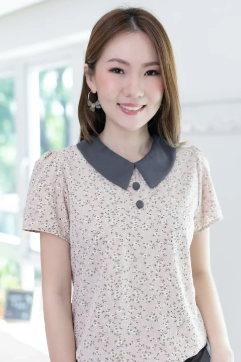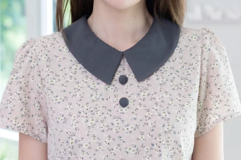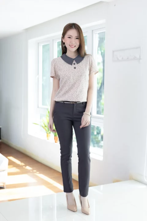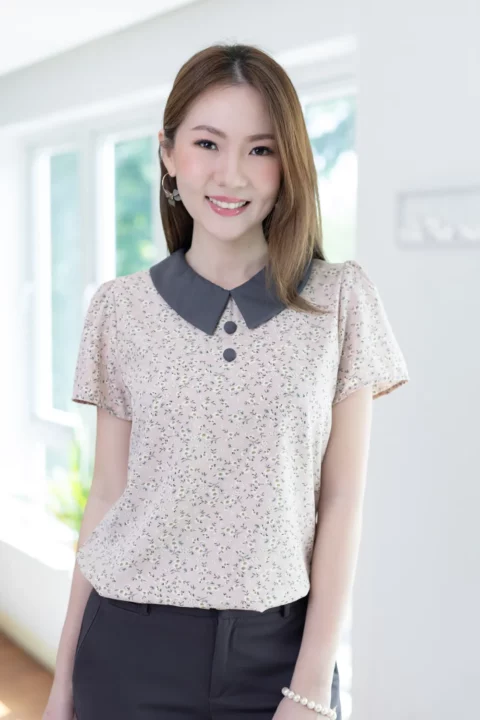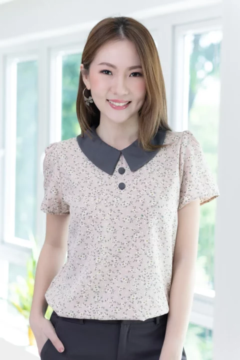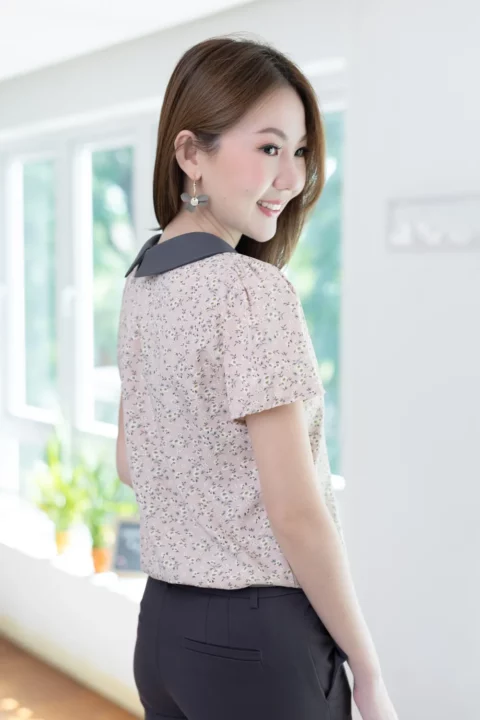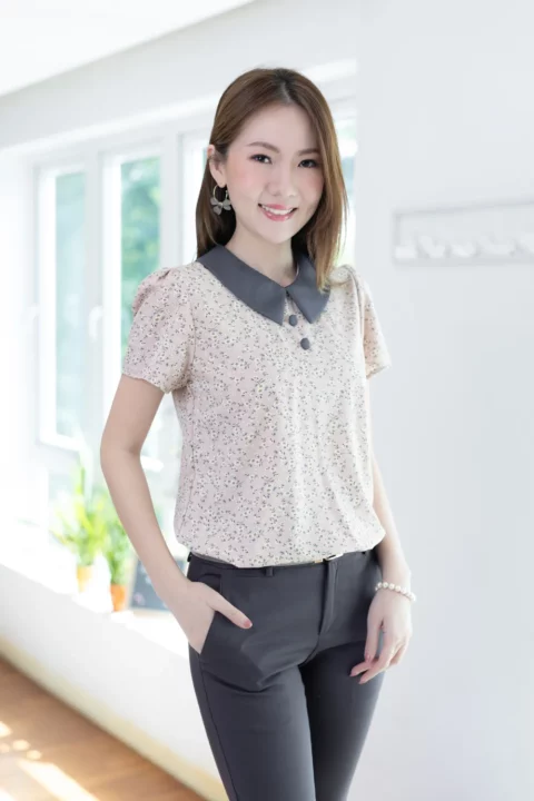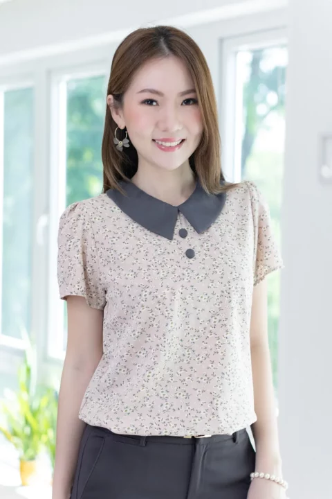 เสื้อทำงานเนื้อผ้านิ่มๆลื่นๆ รีดง่าย ตัวเสื้อใช้ผ้าพิมพ์ลายดอกไม้ ต่อปกบัวตัดปลายแหลมสีพื้น แขนสั้นแบบใส่ง่าย ทรงมีปกสวยสุภาพ แต่งกระดุมปั๊มคู่ด้านหน้า ใส่ได้เรื่อยๆเลยค่ะ
