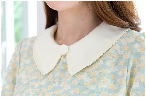 เสื้อทำงานเนื้อผ้านิ่มๆ รีดง่าย พิมพ์ลายดอกไม้สีเหลืองครีมบนพื้นสีฟ้า ต่อปกบัวตัดปลายแหลม แต่งแถบลูกไม้รอบปกสีเข้ากันพร้อมกระดุมเม็ดใหญ่ แขนสั้นแบบใส่ง่าย ทรงมีปกสุภาพ ใส่ได้เรื่อยๆเลยค่ะ