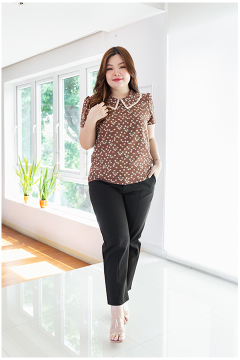เสื้อทำงานเนื้อผ้านิ่มๆ รีดง่าย พิมพ์ลายดอกไม้ ต่อปกบัวตัดปลายแหลม แต่งแถบลูกไม้รอบปกสีเข้ากัน แขนสั้นแบบใส่ง่าย ทรงมีปกสุภาพ ใส่ได้เรื่อยๆเลยค่ะ