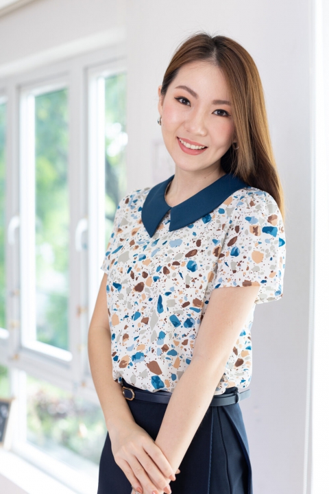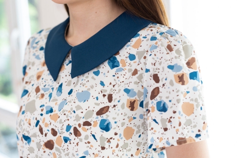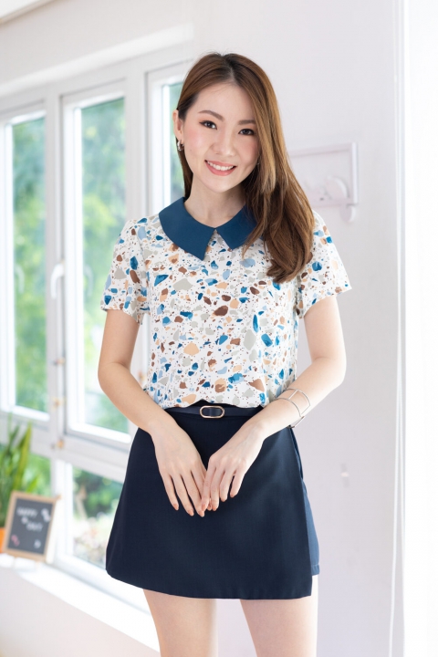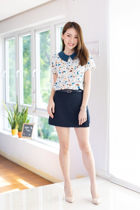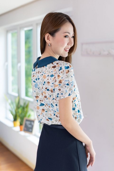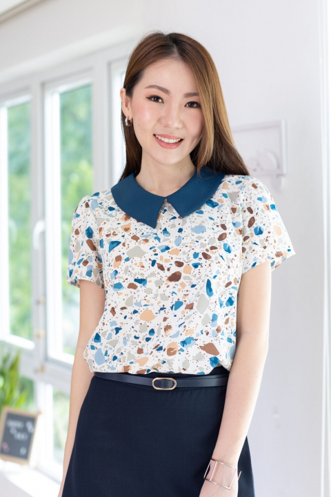 เสื้อทำงานเนื้อผ้านิ่มๆ รีดง่าย พิมพ์ลายกราฟิกหินขัด ต่อปกบัวตัดปลายแหลมสีน้ำเงินเข้มเข้ากับลายผ้า แขนสั้นแบบใส่ง่าย ทรงมีปก สวยสุภาพ ใส่ได้เรื่อยๆเลยค่ะ